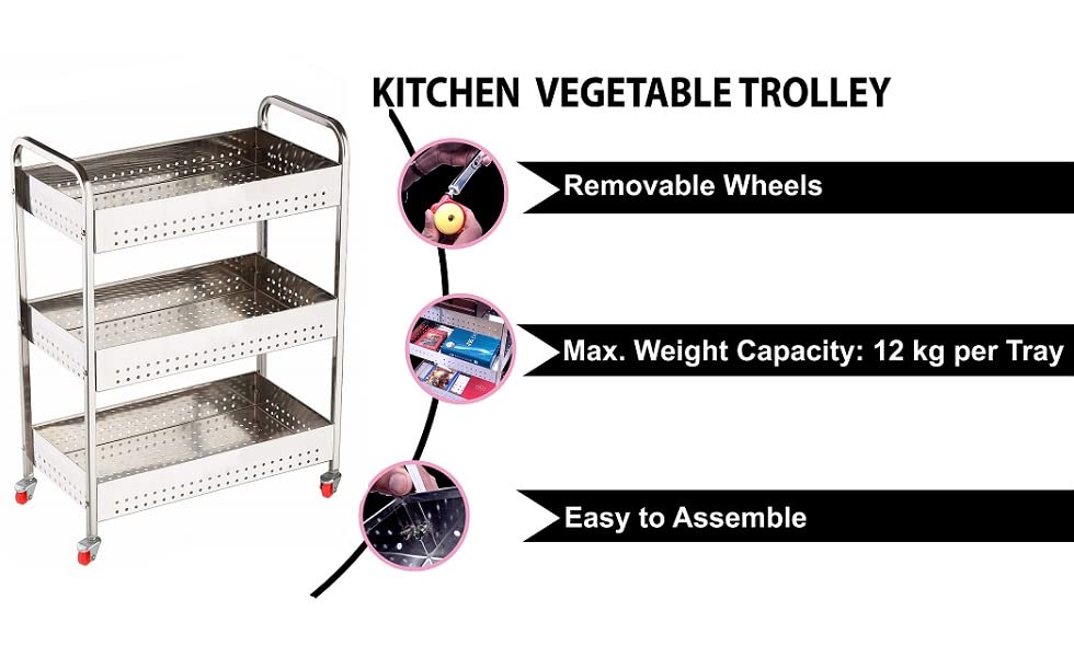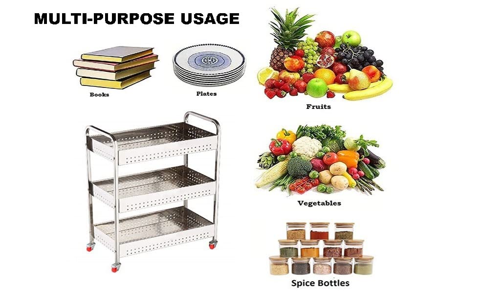 PREMIUM STAINLESS STEEL BUILD: This 3 Tier Stainless Steel Vegetable Trolley is crafted from high-quality, rust-proof stainless steel, ensuring long-lasting performance and durability. Its sleek silver finish adds a modern and elegant touch to any kitchen or home interior.
