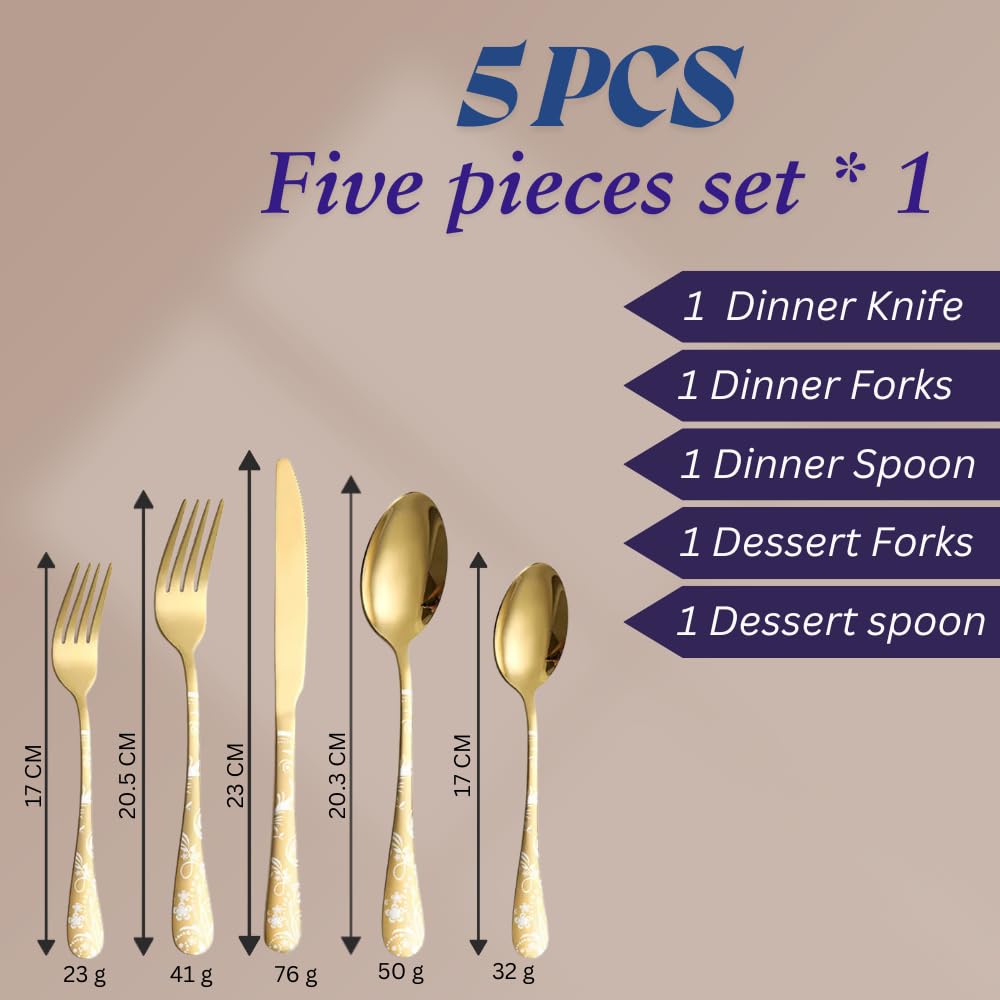 ✨ Complete 5-Piece Flatware Set – This golden cutlery set includes a Dinner Knife, Dinner Fork, Dinner Spoon, Dessert Fork, and Dessert Spoon, making it ideal for both everyday dining and special occasions.