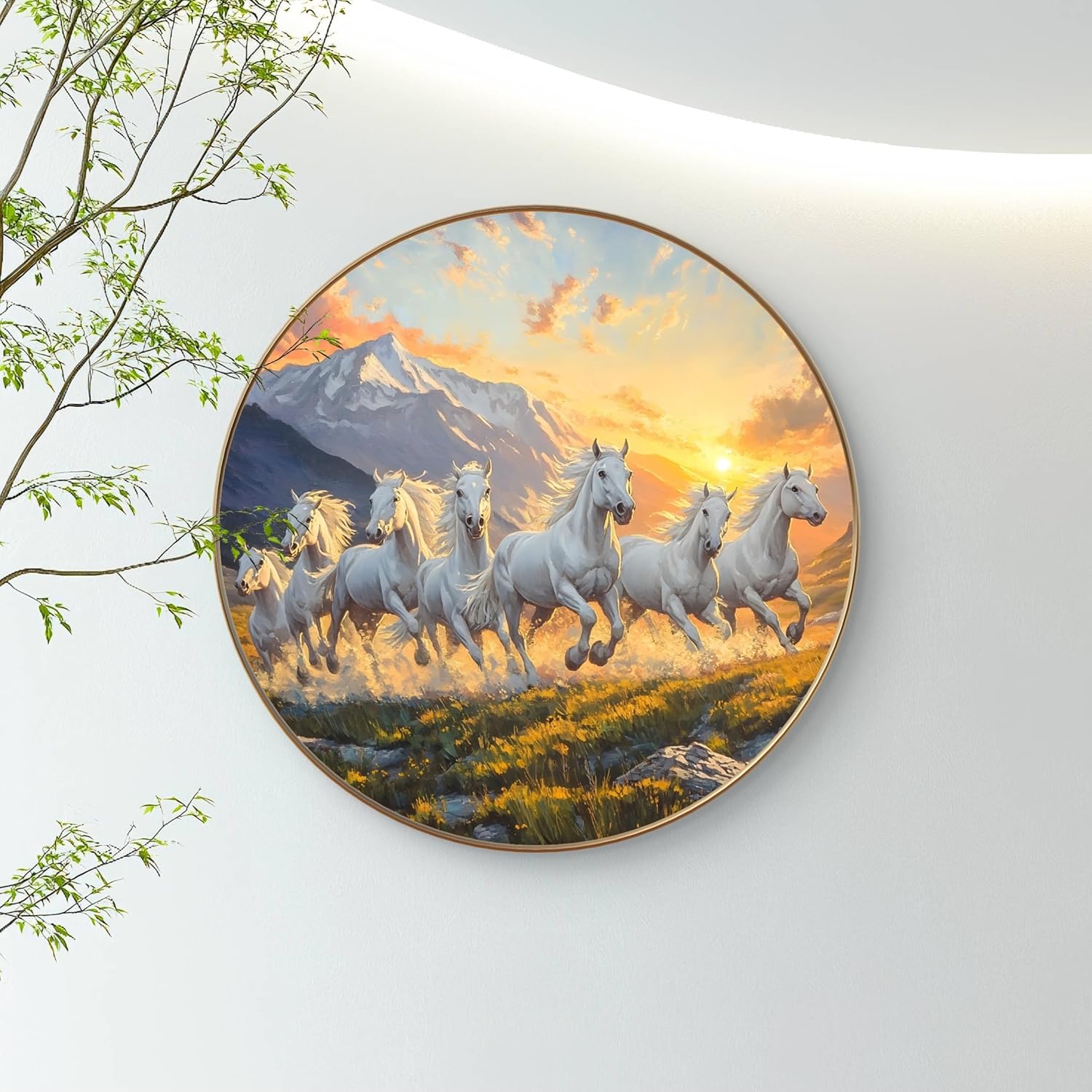 Bring a touch of majesty, elegance, and modern artistry into your home with the 7 Running Horses Wall Painting with Frame Sparkle Glossy Round Golden Framed. This exquisite wall art captures the energy and freedom of seven magnificent white stallions galloping across an open space, symbolizing strength, power, and vitality. Perfect for living rooms, bedrooms, family rooms, offices, and hallways, this round framed wall painting is not only a decorative masterpiece but also a statement of style and luxury.
