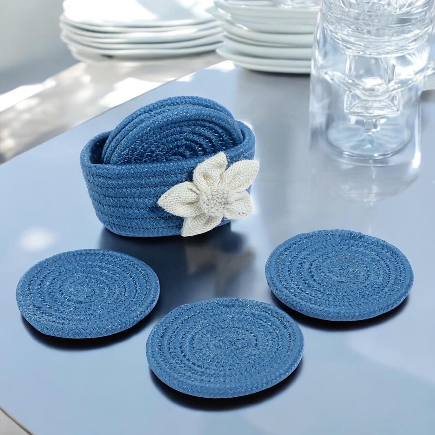 Featuring a modern blue and white floral pattern, these woven coasters add a soft decorative touch without overpowering your table setting. The minimalist boho-inspired design blends seamlessly with various décor styles, including: