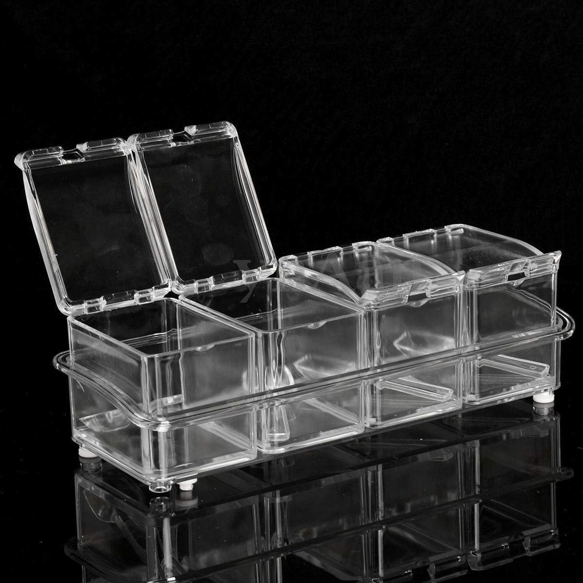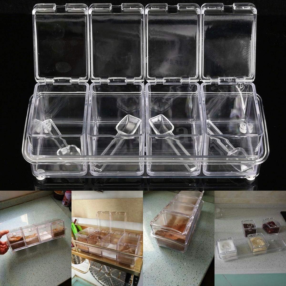 This elegant spice container set is crafted from crystal-clear, food-grade acrylic, offering durability with a sleek and modern appeal. It features four individual compartments, each with its own flip-top lid and dedicated serving spoon, ensuring convenient access to your favorite seasonings without any mess.
