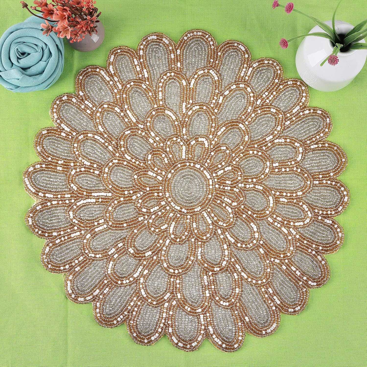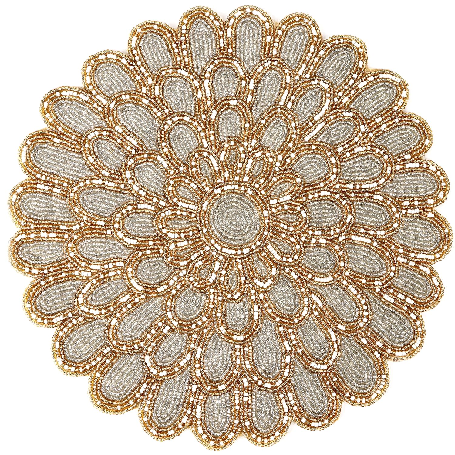 Beaded Table Mat – Elegant Handmade 13” Decorative Placemats for Dining Table, Kitchen & Home Décor (Gold Silver Light)