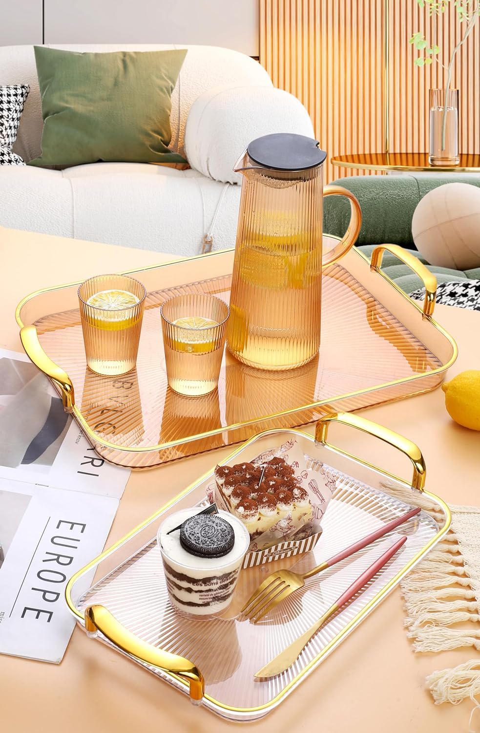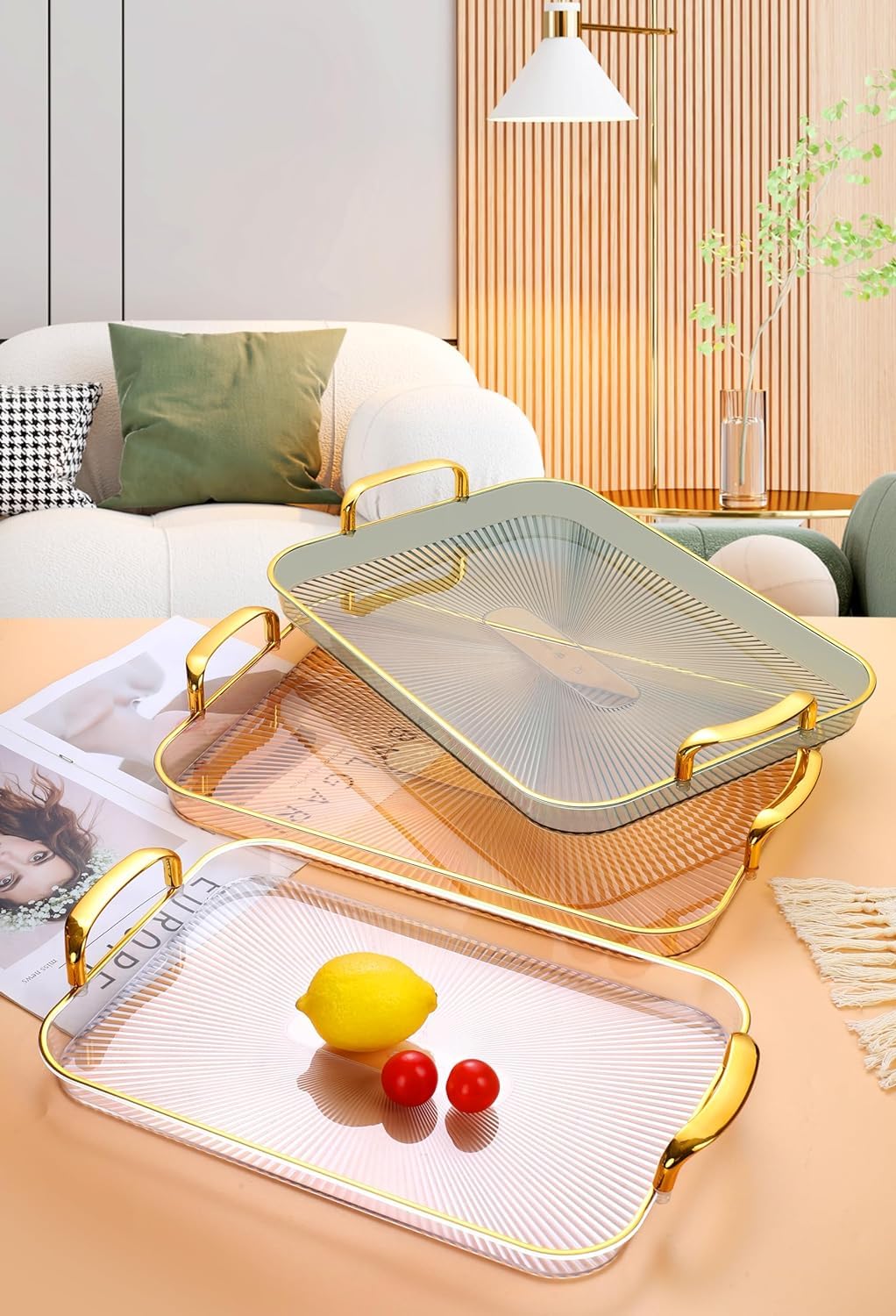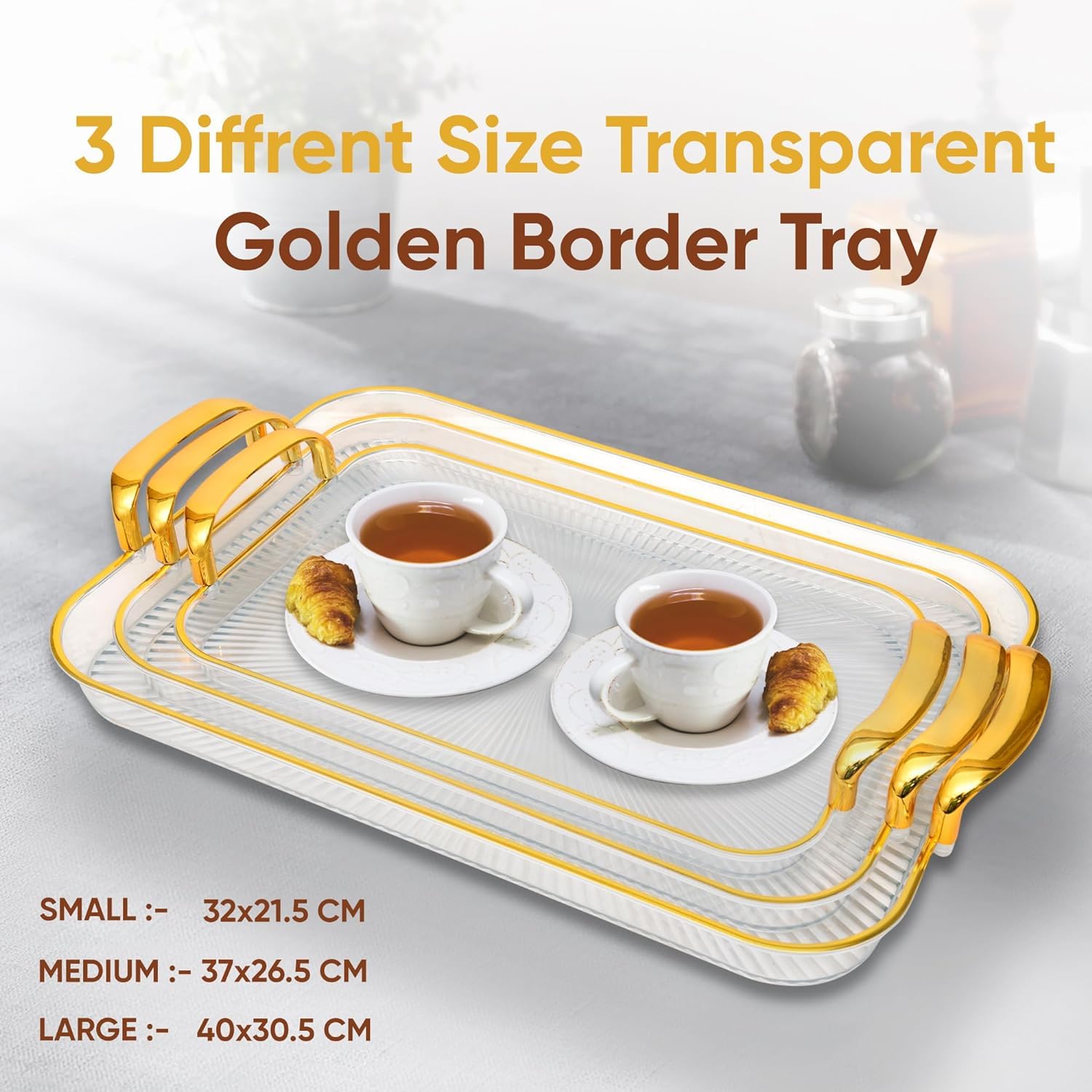 Made from high-quality transparent acrylic and paired with stylish gold-tone metal handles, this tray set seamlessly enhances any interior theme — modern, classic, minimalist, or luxury décor. Each tray is lightweight yet sturdy, waterproof, and extremely easy to maintain, making it ideal for households that value both design and practicality.