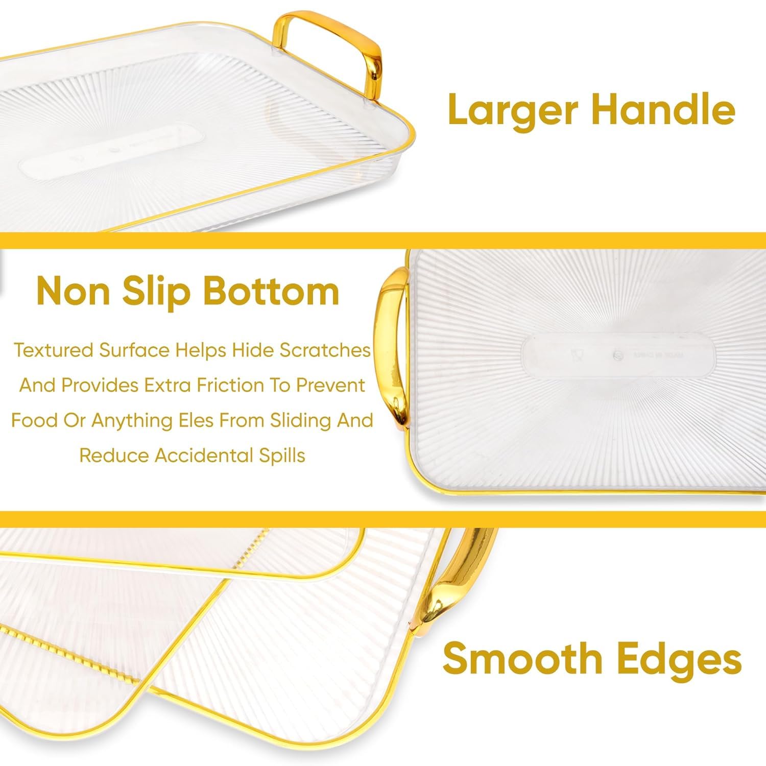 Crafted with high-grade acrylic, these trays offer long-lasting performance without losing shine. The gold handles not only add style but also ensure a comfortable grip, making serving safe and effortless.