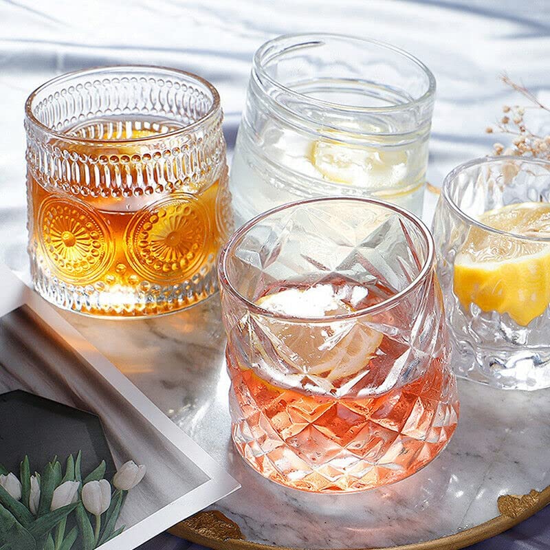 Dancing Whiskey Glass with Rotatable Bottom – Antique Transparent Embossed Crystal Glass (170 ML)