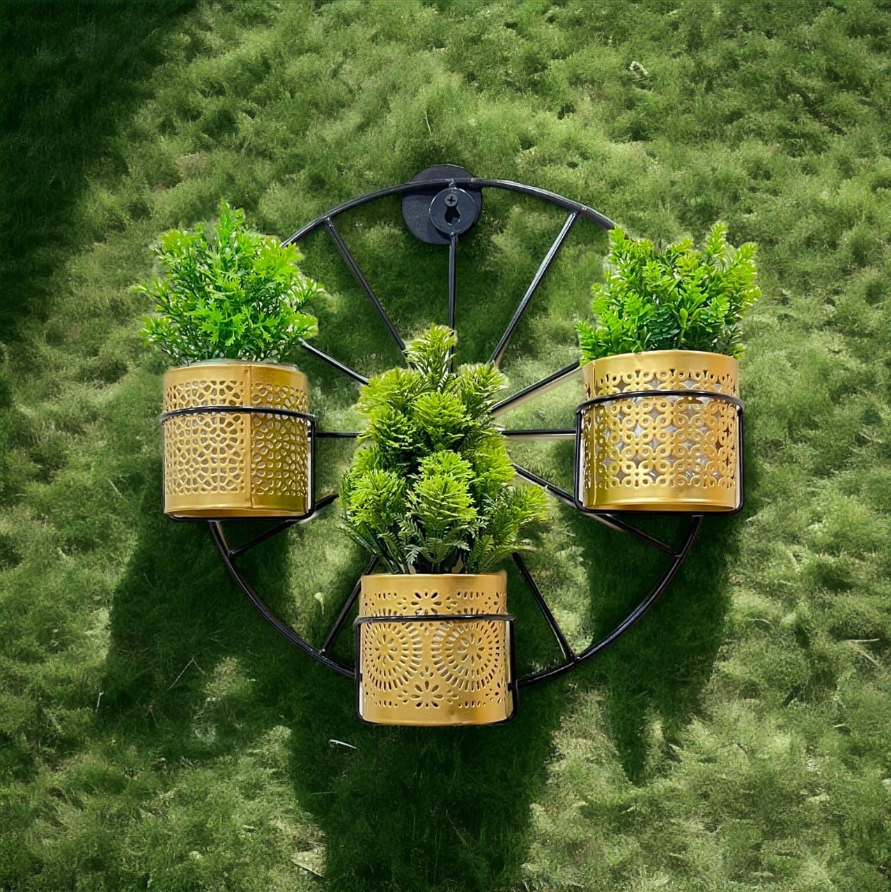 Decorative Wall Hanging Metal Planter Pots with Wheel Shape Stand – Gold & Black, Metal, Art Deco Style