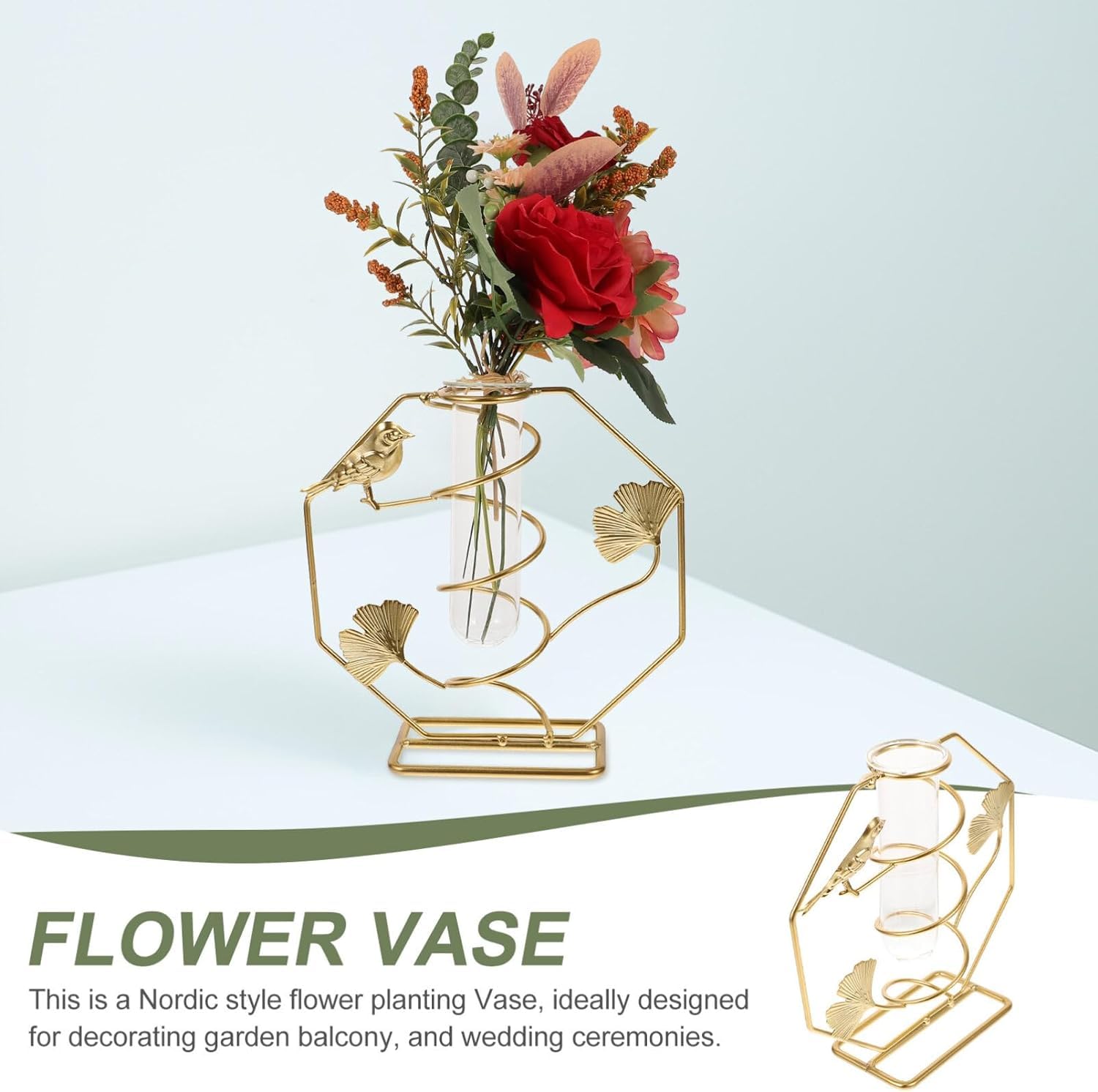 This decorative flower vase features a stylish hexagon-shaped gold metal frame adorned with bird and lily detailing. The clear glass test tube holder enhances the modern Art Deco look, making it a sophisticated décor accent. -