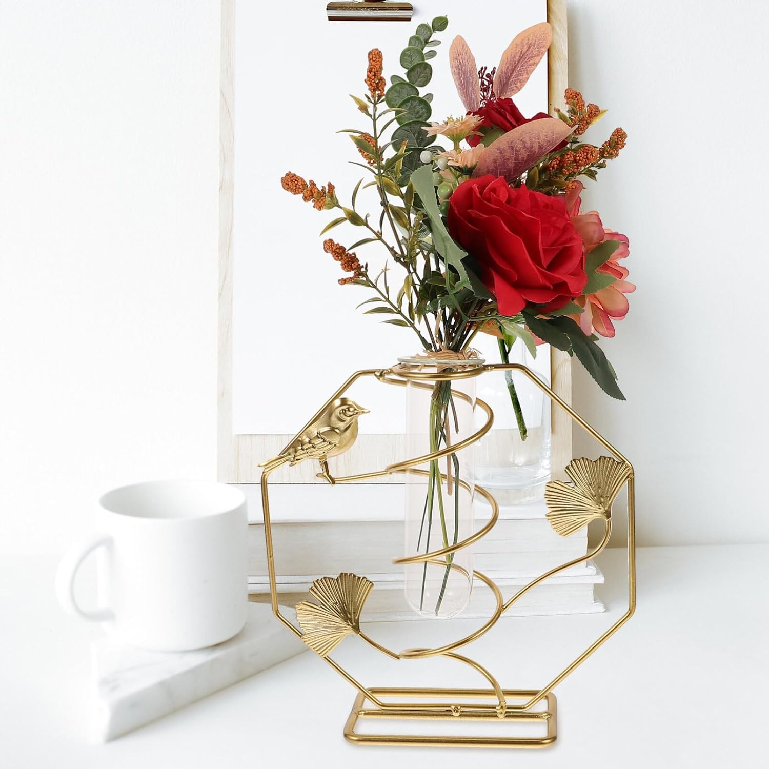 Decorative Bird & Lily Metal Hexagon Shape Flower Vase Stand with Clear Glass Test Tube Holder – Elegant Art Deco Home Décor Accent