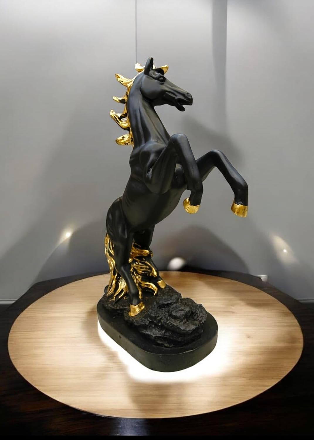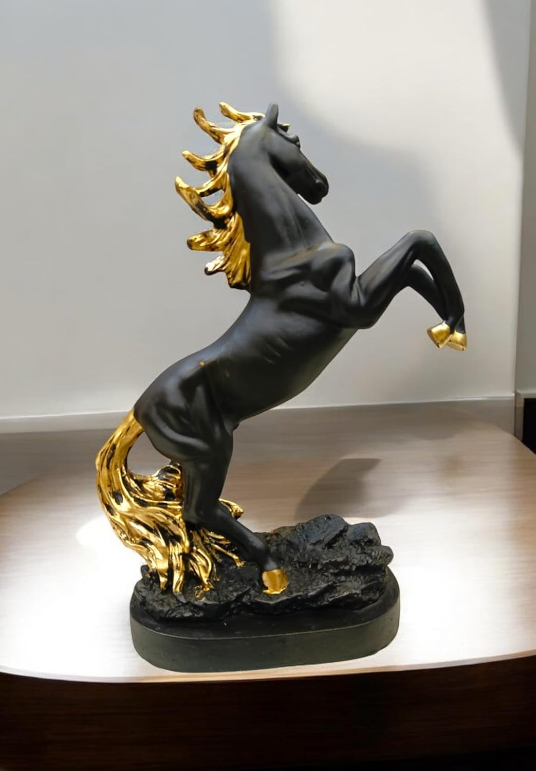 This decorative horse statue features a majestic rearing stallion captured in a dynamic pose that symbolizes strength, ambition, and confidence. The striking matte black body is beautifully contrasted with luxurious golden accents on the mane, tail, and hooves, creating a bold and visually captivating décor piece.