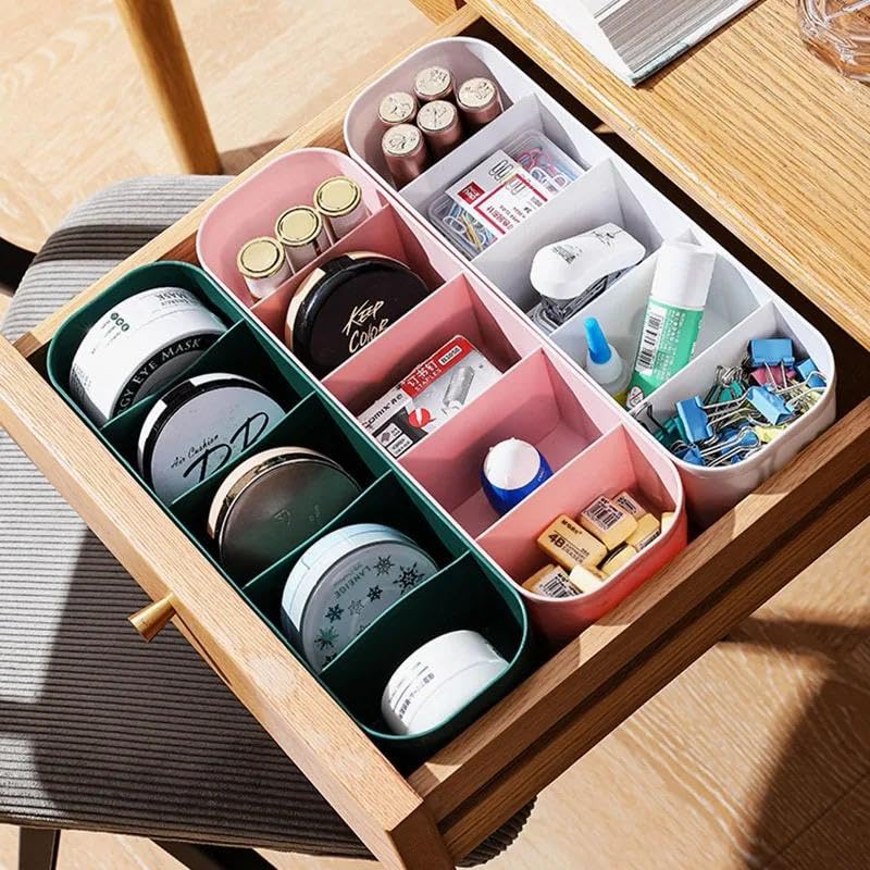 The organiser is built with a rectangular shape, making it compatible with most standard-sized drawers. Its multi-compartment layout ensures maximum utilisation of drawer space without overcrowding. Each storage box is divided into several sections of practical depth, helping you store different items in dedicated pockets. This clever design prevents mixing, keeps everything visible, and saves time during your daily routine.