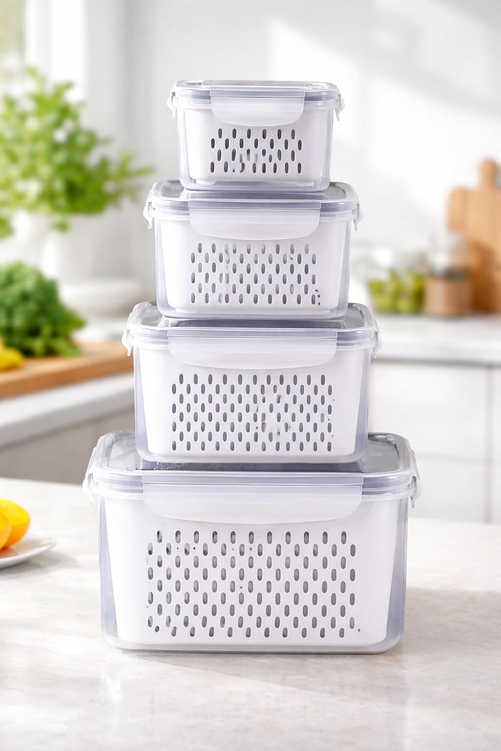These fridge storage containers feature built-in drain baskets that effectively remove excess water after washing. By preventing moisture buildup, they help reduce sogginess, spoilage, and unpleasant odors, keeping fruits and vegetables fresher for longer periods.