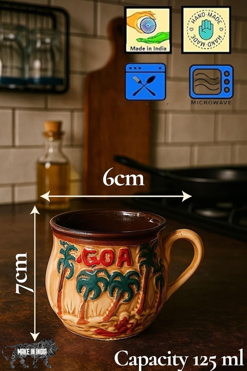 Each mug in this set features a carefully designed, hand-painted style showcasing iconic Goa elements — serene palm trees, golden sunsets, soft waves, tropical patterns, and the signature “GOA” typography that instantly transports you to your favourite beach moments. The rustic brown and beige tones give the mugs a raw, antique look, making them perfect for those who love earthy, coastal, and artisanal aesthetics.