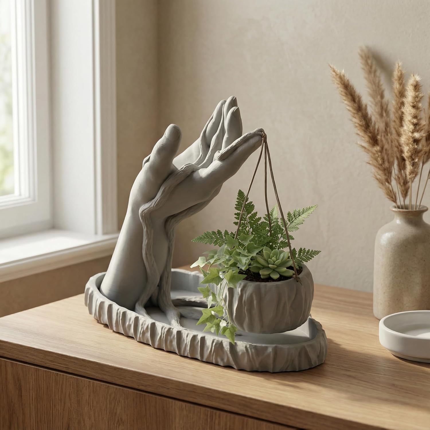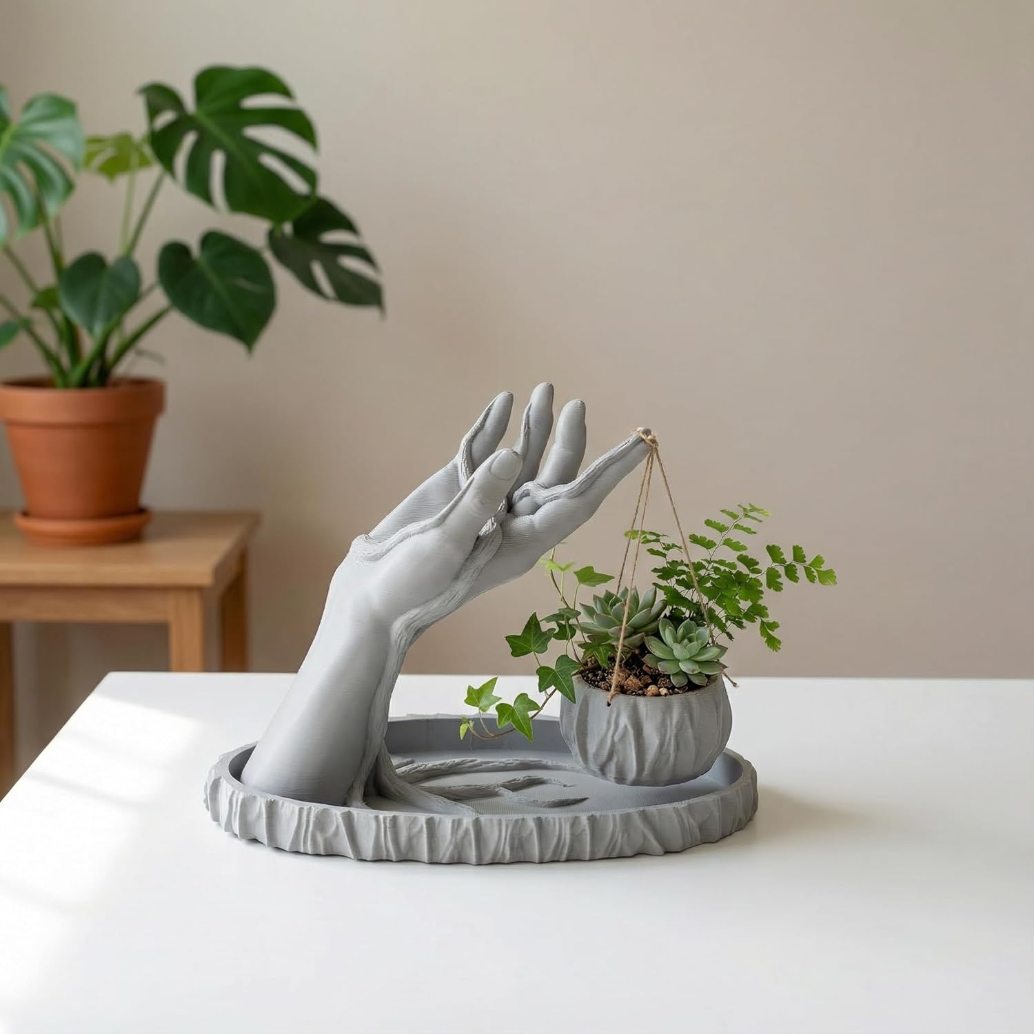 The Hand Sculpture Planter with Hanging Pot is specially designed for small indoor plants and decorative greenery. It is ideal for: