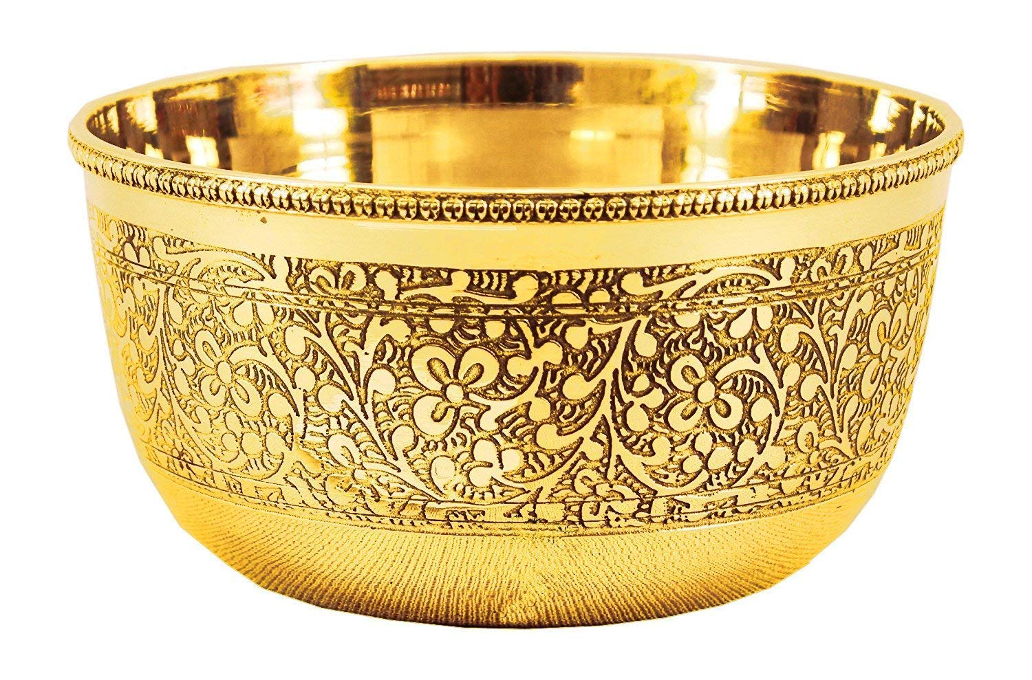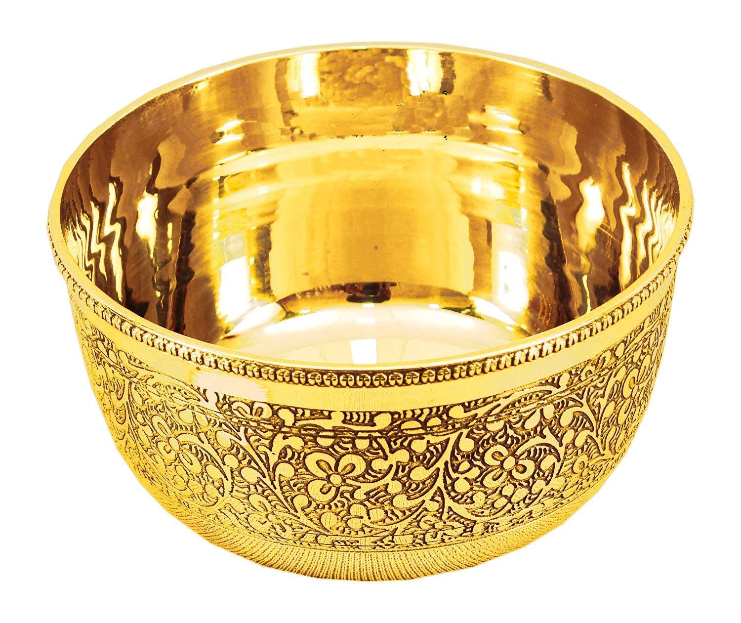 Its compact dimensions—height 5.5 cm, breadth 5 cm, and diameter 10 cm—make it versatile for both functional and decorative purposes without occupying too much space.golden brass bowl for home décor