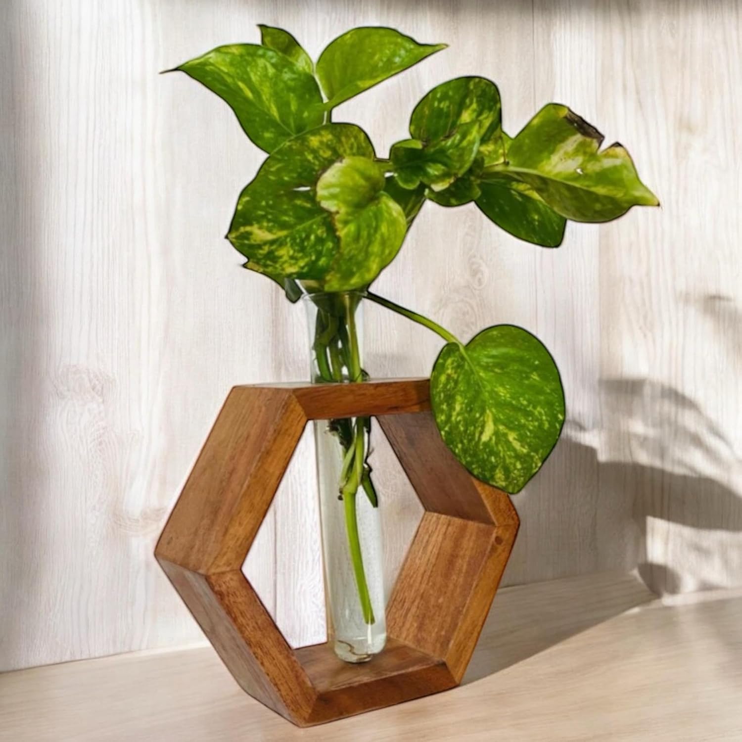 This hexagonal wooden vase is specially designed for hydroponic indoor plants, allowing greenery to thrive in water without soil. It is perfect for: