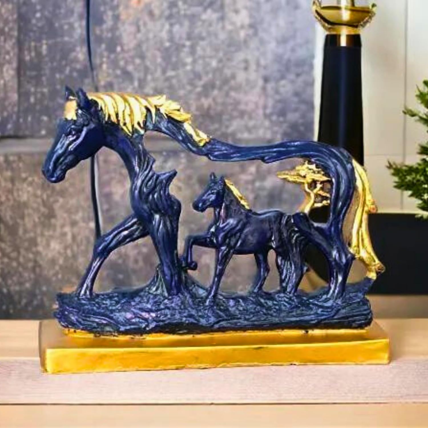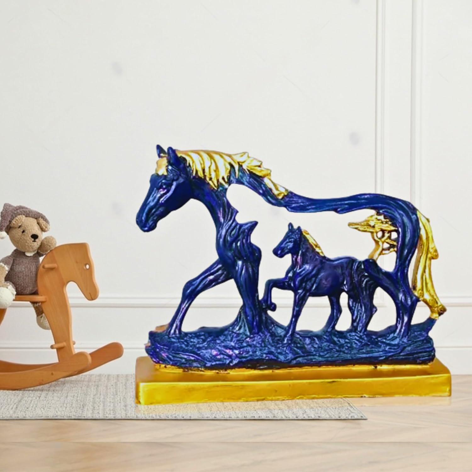 Add a sense of strength, success, and elegance to your home décor with the Horse Statue with Baby Horse Resin Finish Animal Figurines. Beautifully crafted in a rich navy blue color with refined gold accents, this traditional décor piece features a majestic horse accompanied by its foal in a dynamic, forward-moving pose. The design captures motion, bonding, and ambition, making it both visually striking and symbolically meaningful.