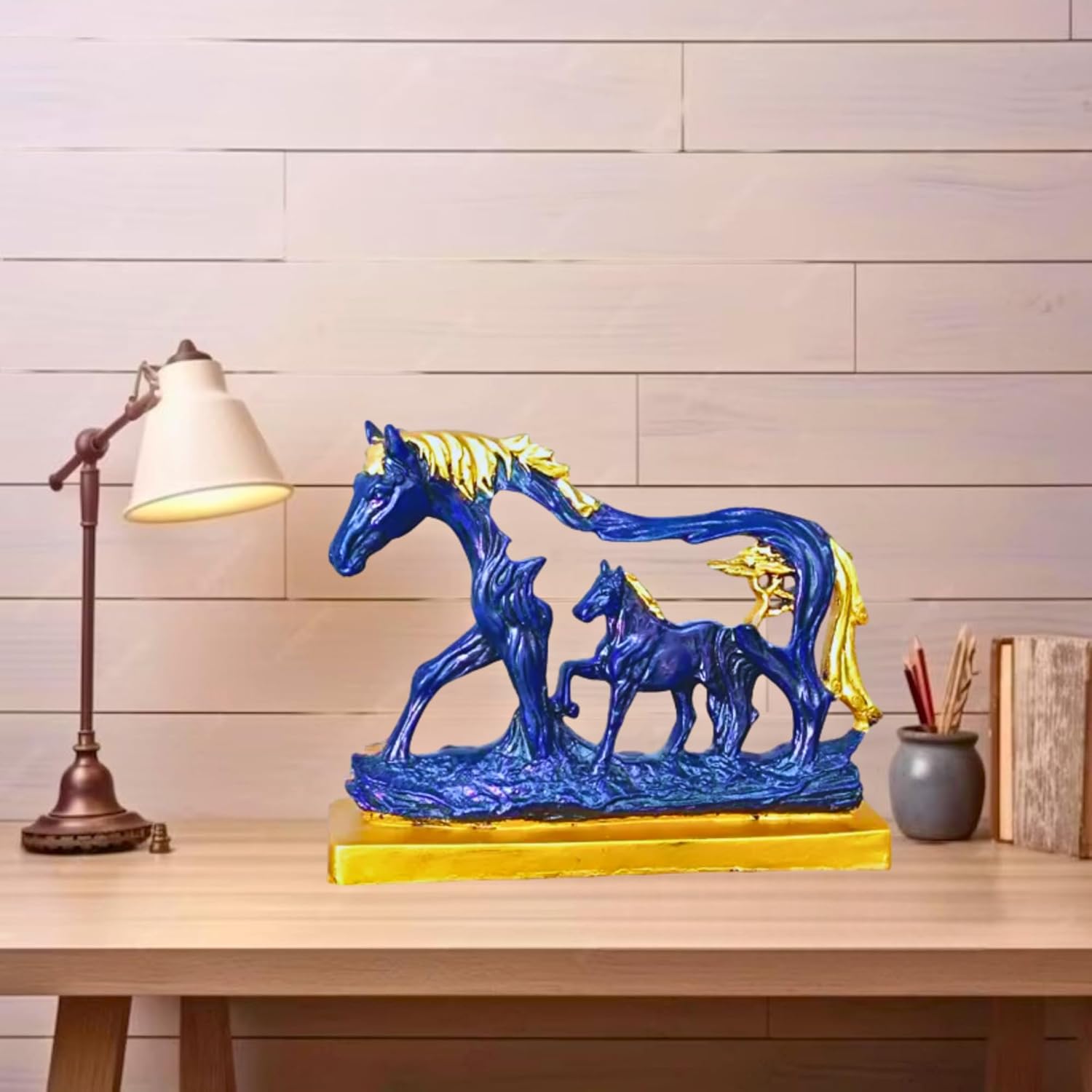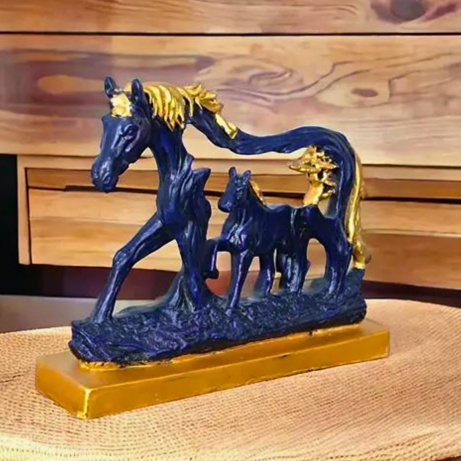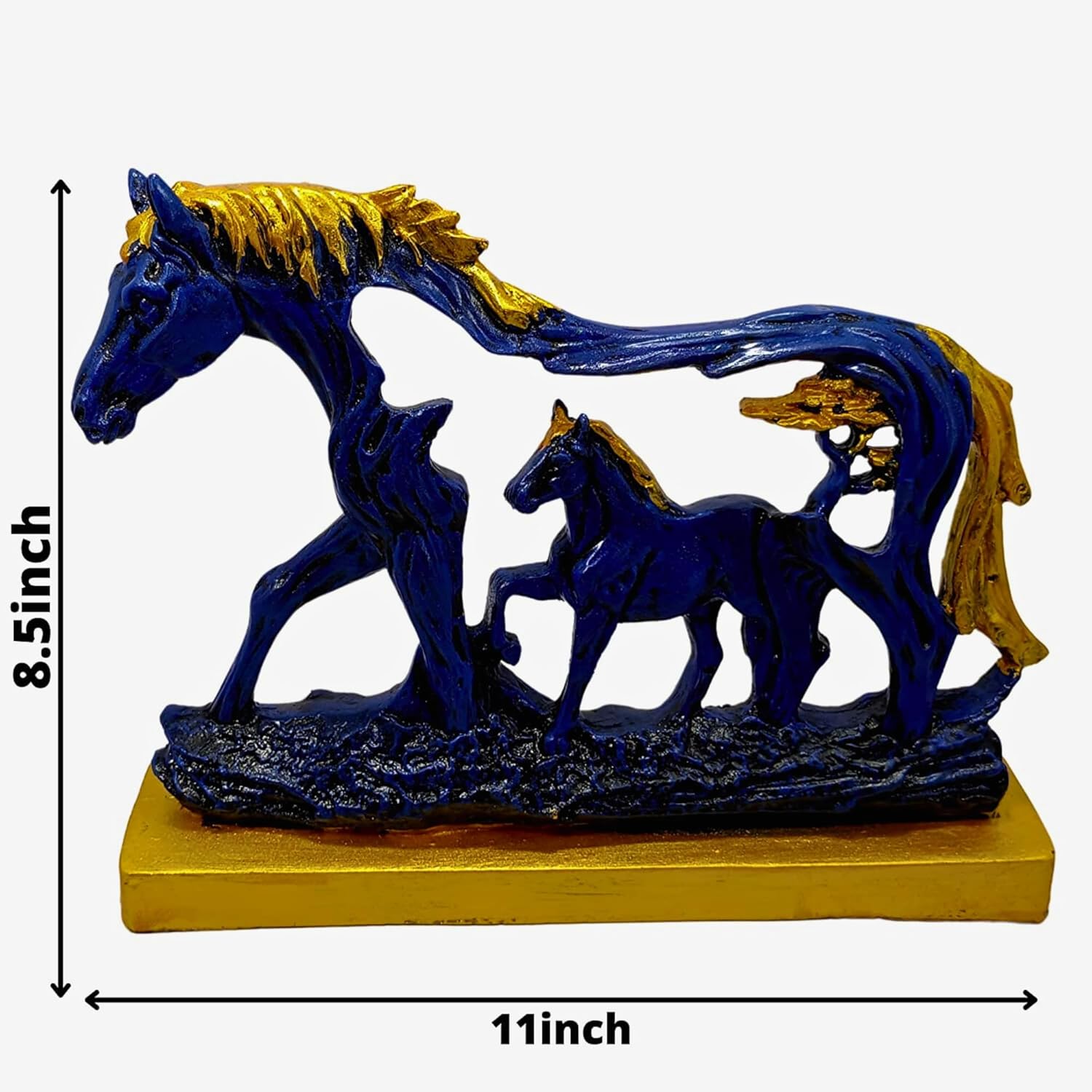 Bring timeless elegance, emotional warmth, and powerful symbolism into your living space with the Horse Statue with Baby Horse Resin Finish Animal Figurines. Designed in a rich navy blue color with refined gold accents, this beautifully crafted decorative showpiece represents success, fame, financial growth, strength, endurance, and family prosperity. With its traditional styling and meaningful design, it serves as both an artistic décor element and a symbol of positive energy for your home.