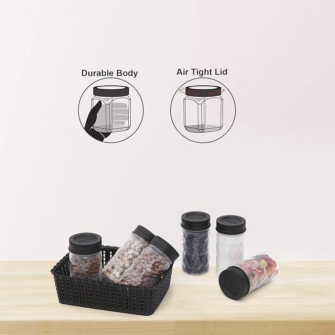 Each jar features a secure airtight black lid that effectively seals in aroma and freshness while preventing the entry of moisture, air, insects, and other contaminants. This makes the containers ideal for storing spices, masalas, pickles, dry fruits, coffee beans, tea leaves, mouth fresheners, and snacks.