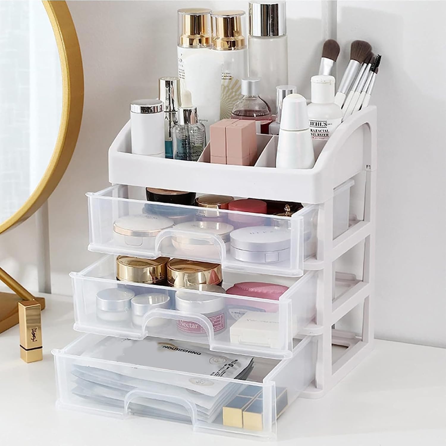 Keep your beauty essentials neatly organized with this Large Capacity 3-Layer Makeup Storage Box. Designed with three spacious drawers and a sectioned top compartment, it offers ample room for all your cosmetics, skincare, and accessories. The clear drawer design lets you easily view and access your items, while the sleek white polished finish adds a touch of modern elegance to your vanity or dressing table.