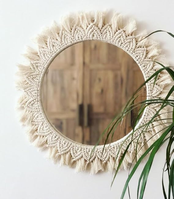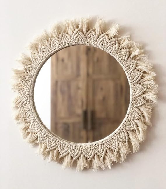 Bring a touch of bohemian charm and artistic elegance to your home with our Macrame Wall Mirror with Fringe. This handcrafted, round mirror features intricate macrame detailing, creating a stunning centerpiece for any wall. Designed for modern and boho-inspired interiors, this decorative wall mirror is perfect for living rooms, bedrooms, hallways, or even bathrooms.