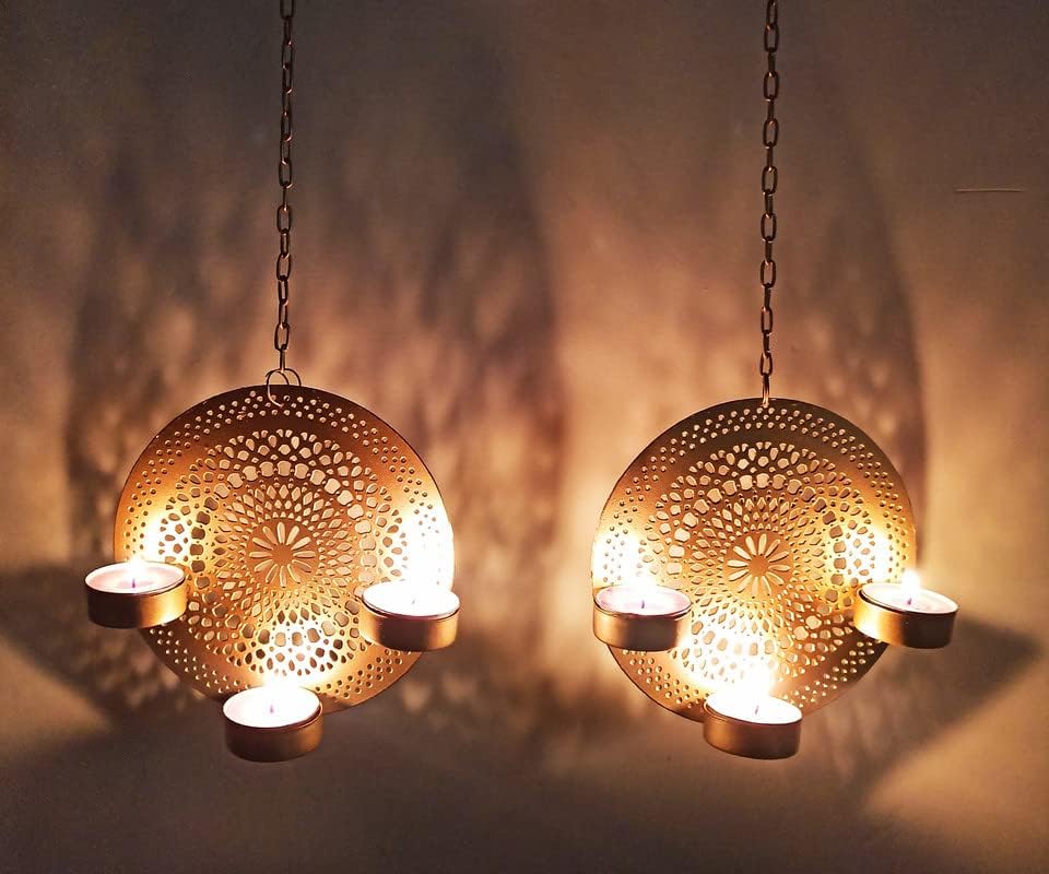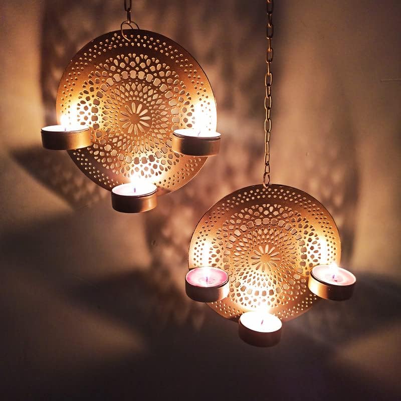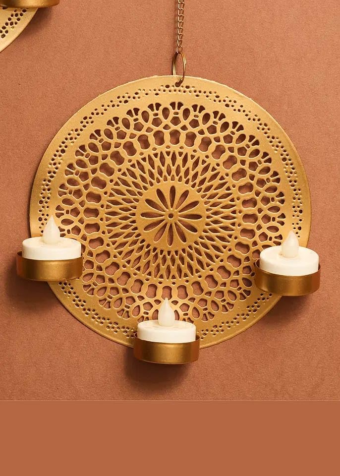 Metal Decorative Hanging Laser Diya – Gold Iron Wall-Mounted Tealight Holder (Set of 2)