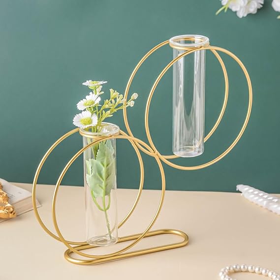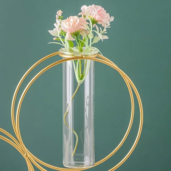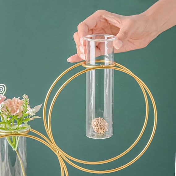 Crafted with a sturdy iron metal frame in a luxurious gold finish and a clear glass test-tube vase, this piece is both durable and visually appealing. Its double ring round design adds a unique artistic flair, making it not just a vase but a statement piece for modern décor.
