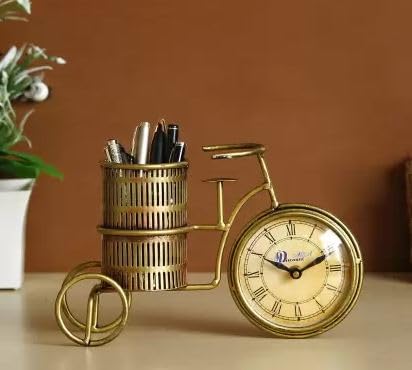 When it comes to combining functionality with timeless décor, the Metal Handmade Decorative Cycle Shape Pen Stand with Clock is the perfect choice. Designed with exquisite craftsmanship and finished in a premium copperish gold polish, this desk accessory is not just a pen holder—it’s a complete decorative showpiece that adds elegance, organization, and style to your home or office.