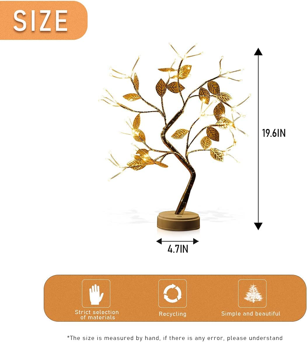 This decorative metal leaf LED table lamp features a beautifully handcrafted bonsai tree design with 36 warm white LED lights and a height of approximately 20 inches, creating a soft, elegant glow for any space. -