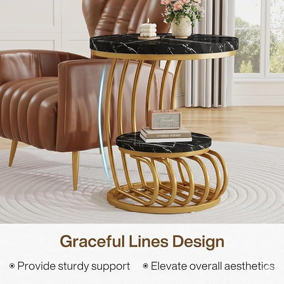 Eye-Catching End Table: Add a touch of modern elegance to your home with this luxurious round end table. Featuring a sleek gold and black wrought iron frame and a rich engineered wood tabletop, this table is designed to stand out in any room. Its contemporary style effortlessly complements modern, minimalist, or industrial interiors.