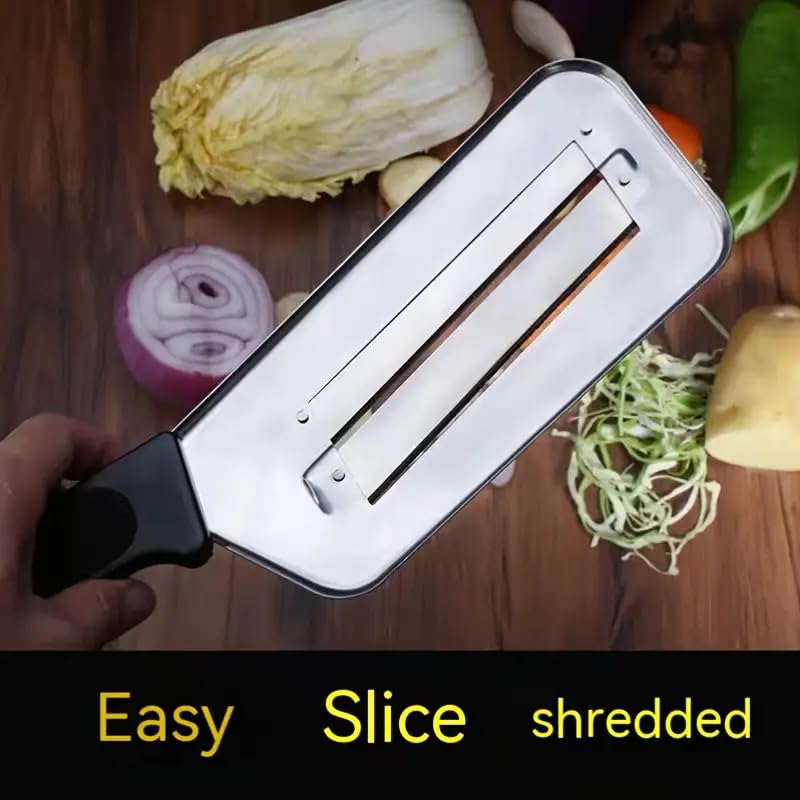 The Multifunctional Stainless Steel Double Blade Slicing Knife is the ultimate solution for fast, efficient, and precise slicing in the kitchen. Designed for both home cooks and professional chefs, this double blade slicer allows you to prepare vegetables, fruits, and cabbage effortlessly while saving time and effort. With its sharp stainless steel blades, ergonomic handle, and versatile functionality, it is a must-have kitchen accessory for anyone who loves cooking or wants to simplify meal preparation.