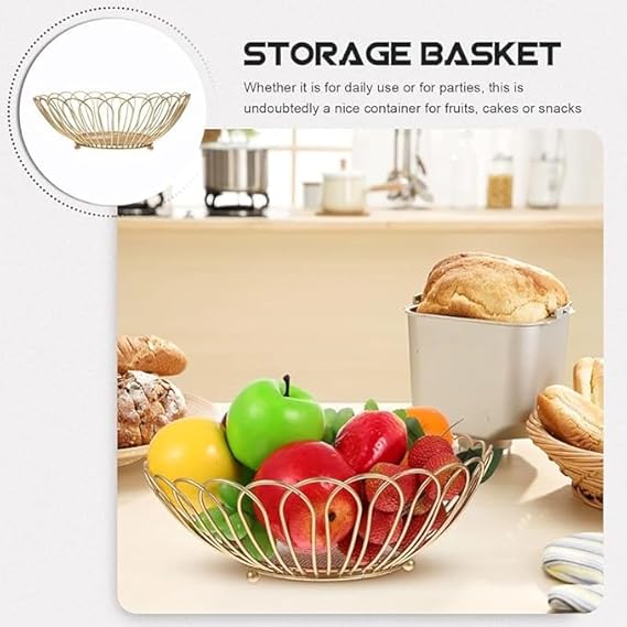 This beautifully crafted metal wire basket is ideal for showcasing fresh, vibrant fruits and vegetables in your kitchen. Its open and spacious design also makes it perfect for serving or organizing bread, snacks, cakes, cookies, candies, and various household essentials—making it a stylish yet practical storage solution.