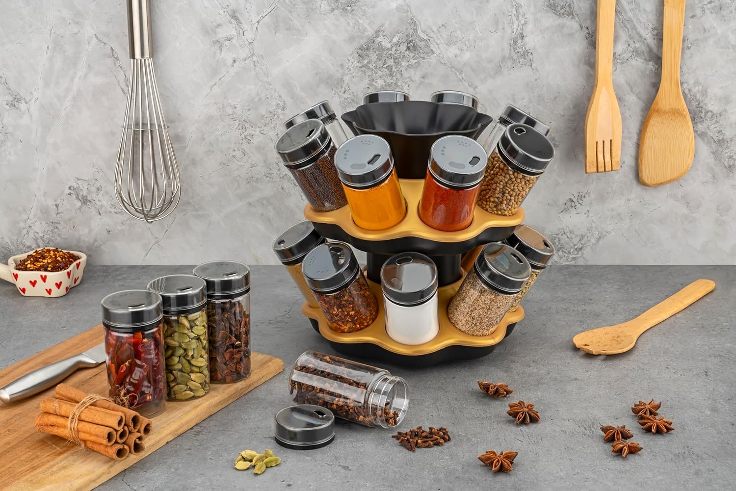 360° Smooth Rotation: The fully rotatable design allows easy access and clear visibility of all containers, making it simple to identify and retrieve spices while cooking.
