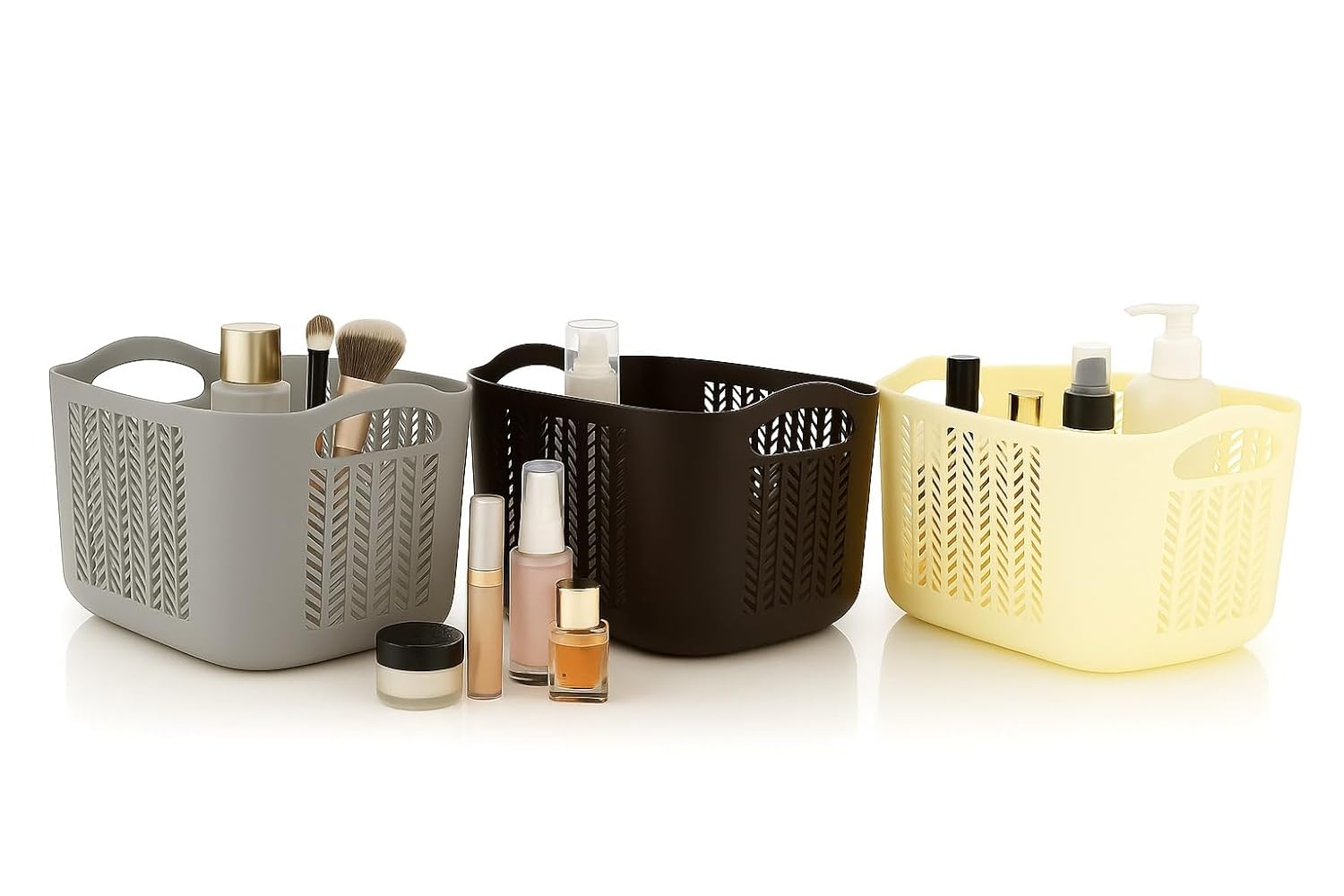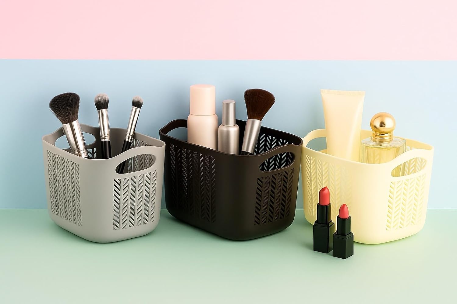 One of the most popular uses of this tray set is makeup and beauty storage. The trays are ideal for organizing makeup brushes, lipsticks, compact powders, foundations, skincare bottles, beauty tools, hair accessories, and daily grooming essentials.