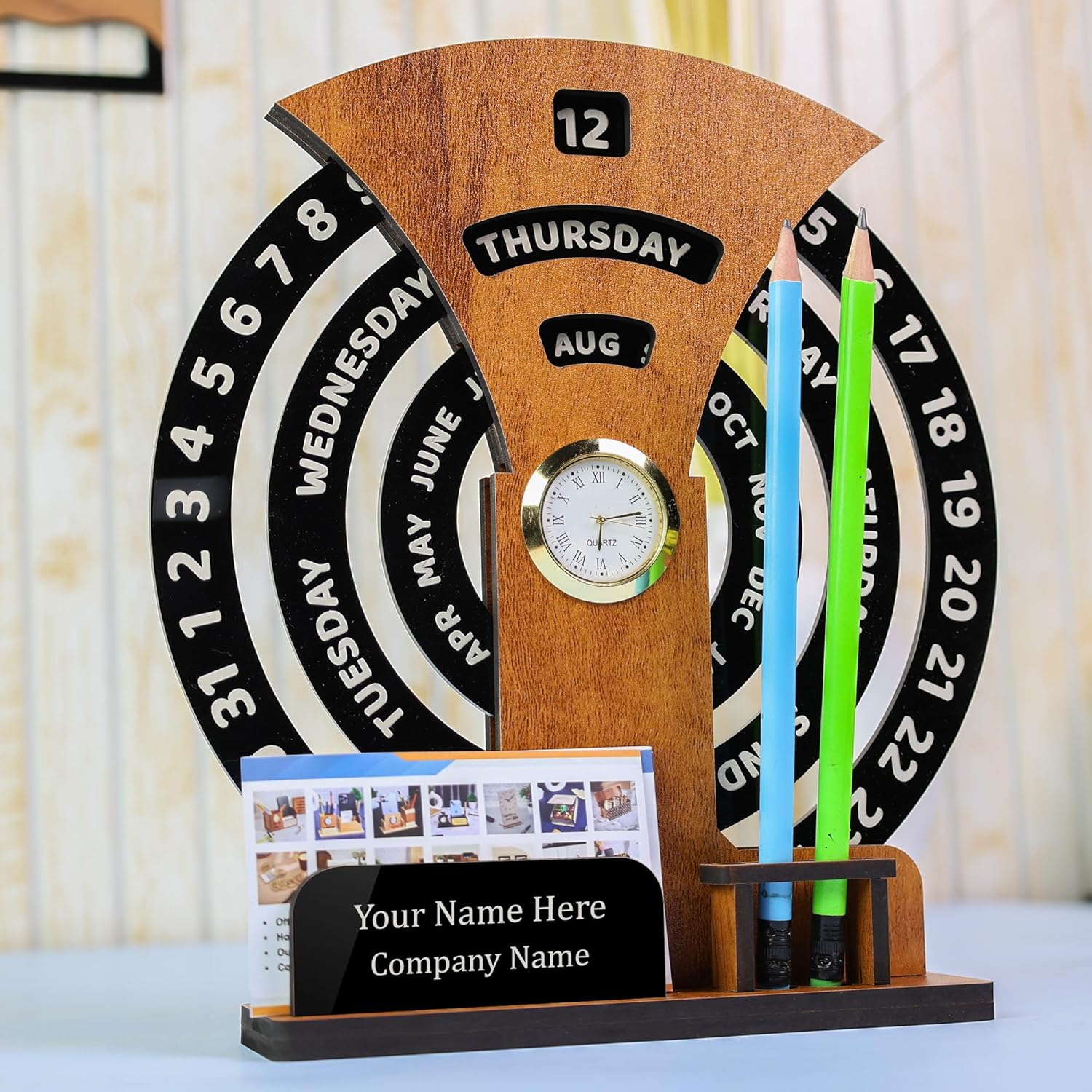 A workspace reflects personality, professionalism, and organization. The Personalized Desktop Calendar Round Wooden with Clock is a perfect blend of style, utility, and personalization, designed to elevate your desk décor while serving multiple everyday functions. Crafted from premium engineered wood with a refined round design, this desktop calendar is not just a time-tracking tool but a lasting statement piece for offices, home workspaces, and gifting purposes.