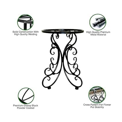 This flower pot stand is made of high-quality iron, ensuring long-lasting durability. Unlike wooden or plastic alternatives, the iron structure remains strong even under heavier pots. The powder-coated black finish not only adds elegance but also protects the stand from rust, scratches, and wear over time.