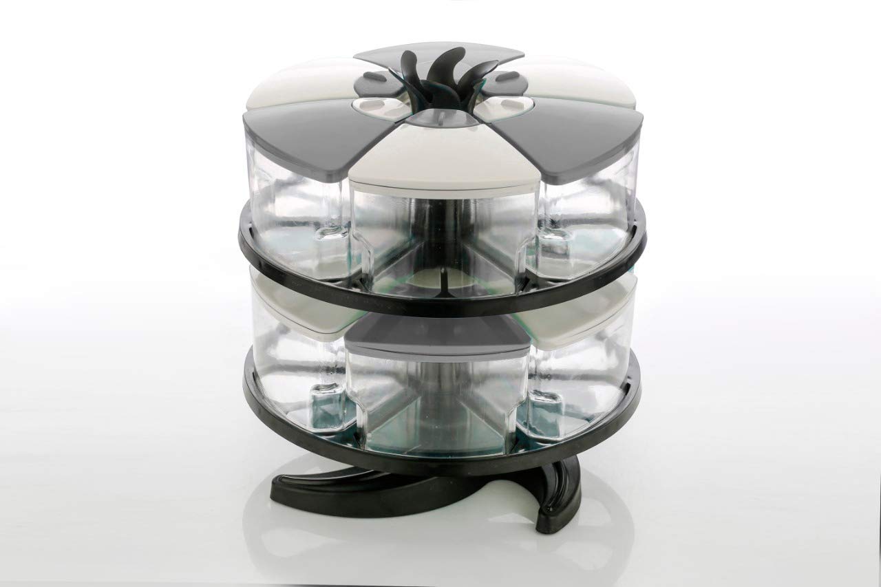 If you struggle with limited kitchen counter or cabinet space, this revolving spice stand is your solution. Its vertical tiered design saves space while offering ample storage capacity.