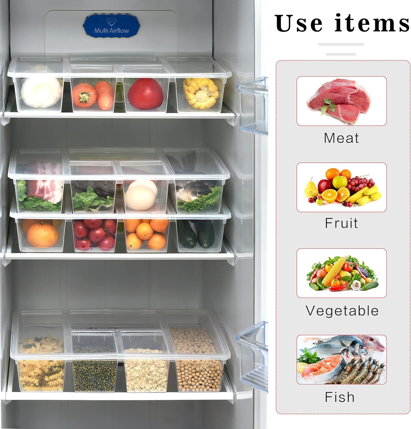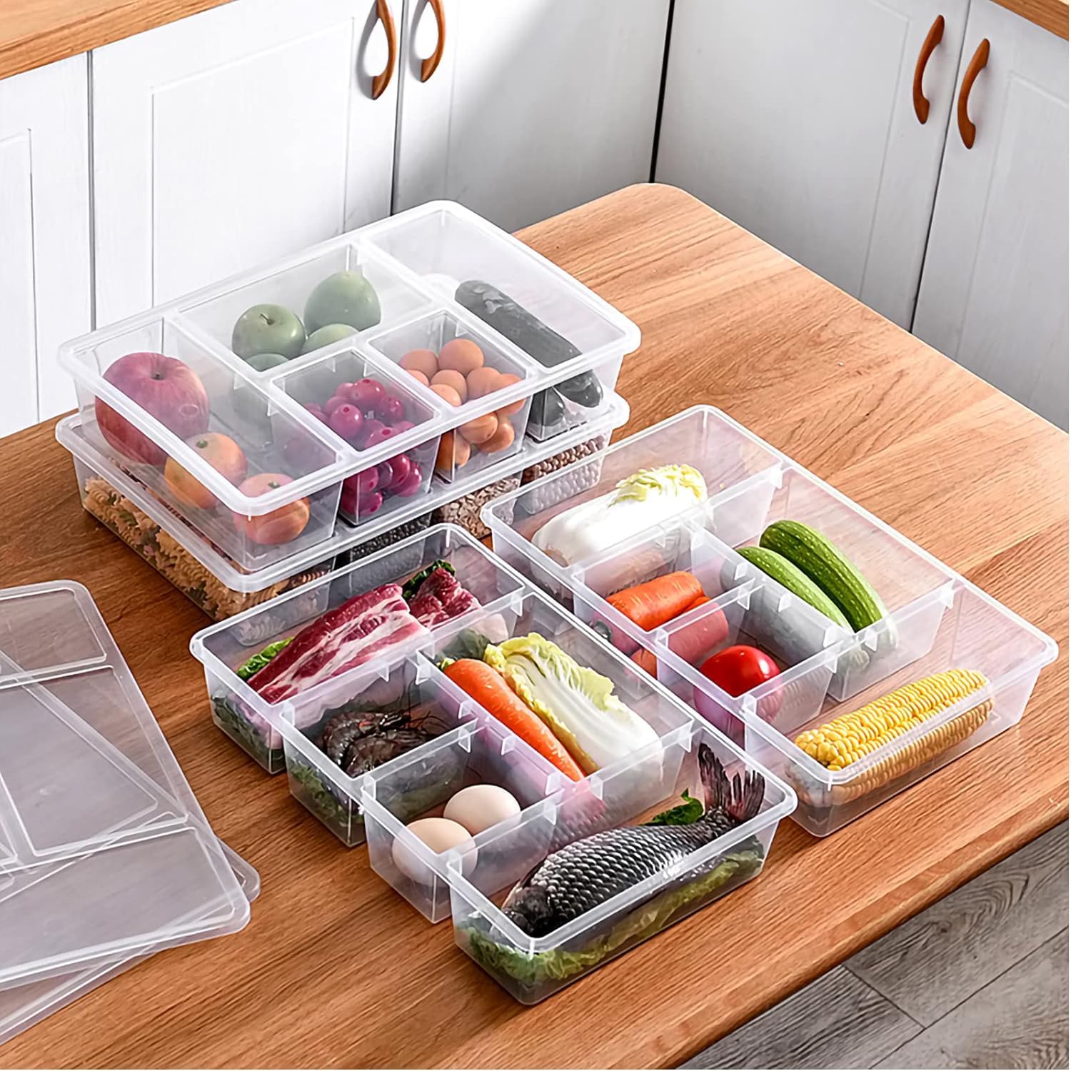 The transparent design helps you easily identify contents at a glance, while the airtight lid keeps food fresher for longer and prevents mixing of odors. With its 5 spacious compartments, this tray is ideal for organizing vegetables, fruits, snacks, meat, or even non-food items like condiments, cutlery, and toys. A perfect solution for modern households that need space-saving storage and long-lasting freshness.