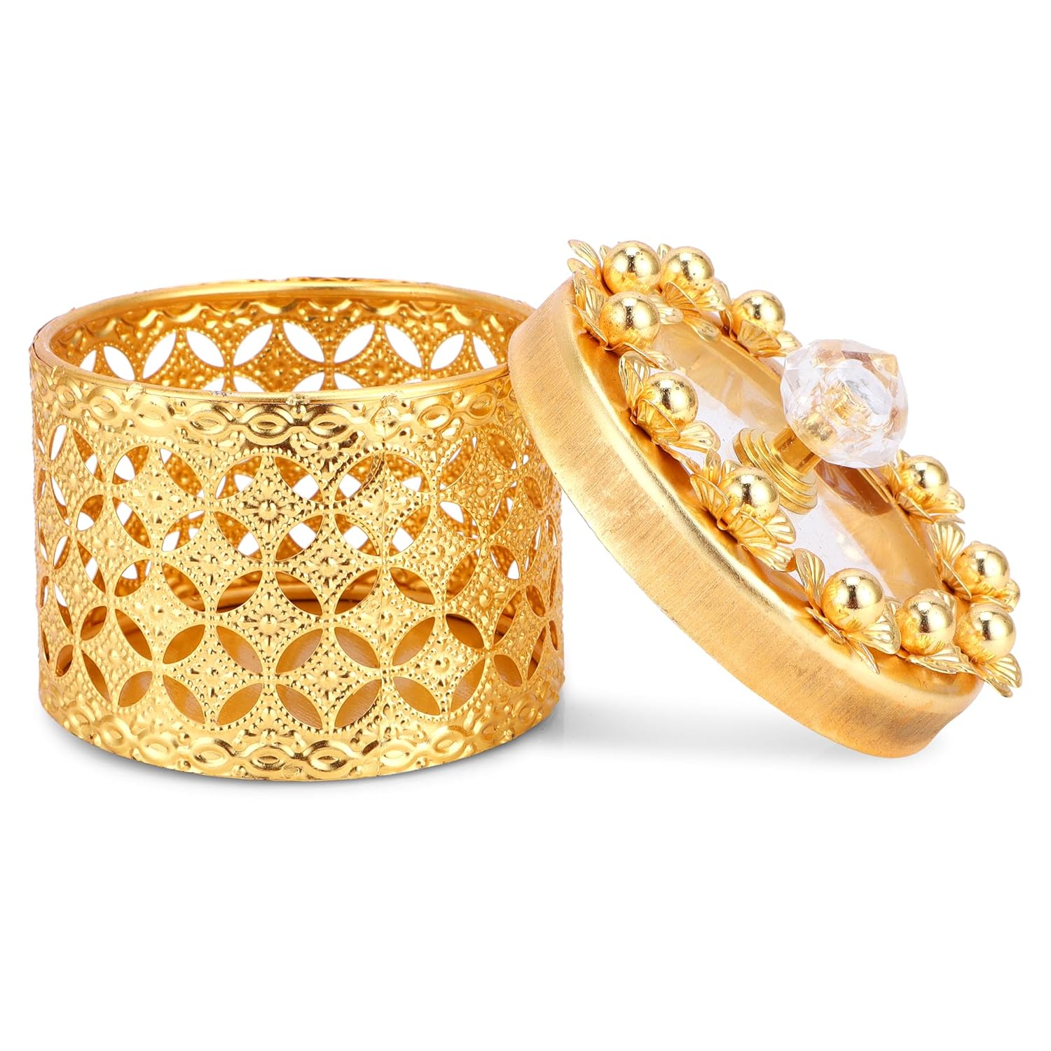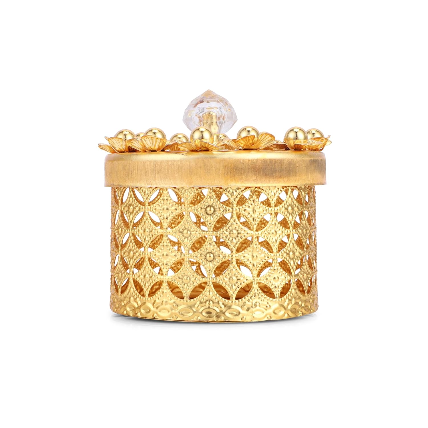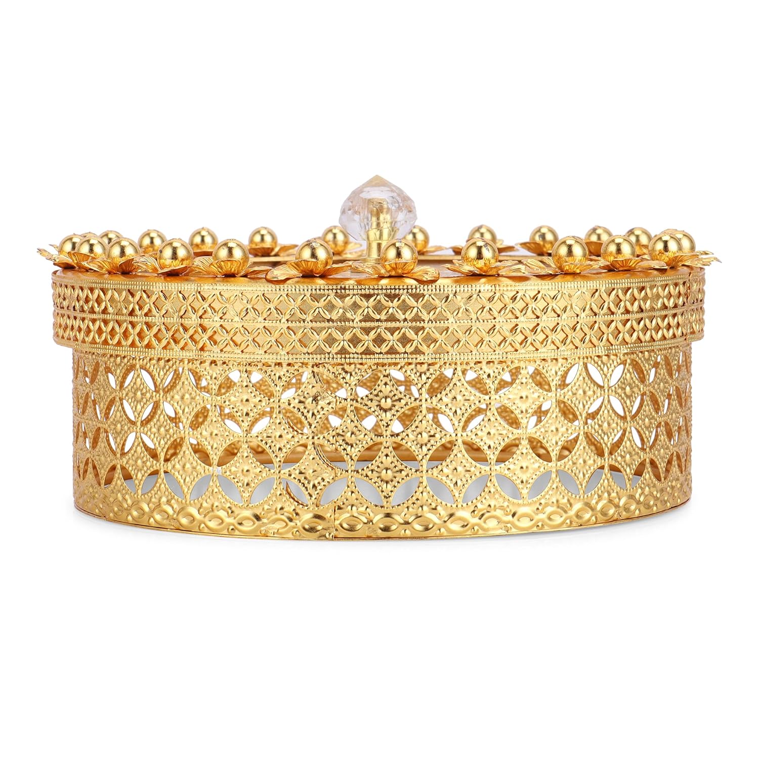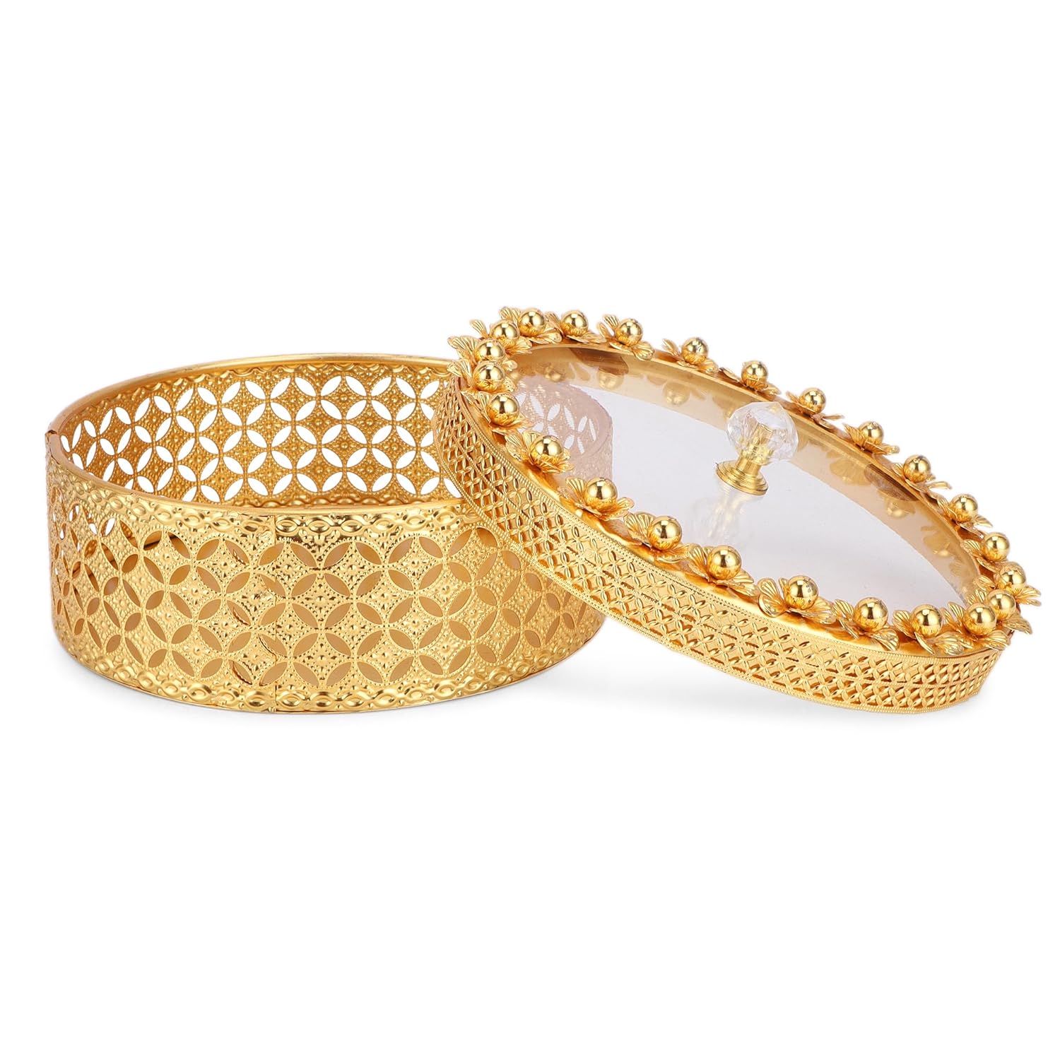 Designed to add a luxurious touch, the intricate gold floral detailing enhances the appearance of dining tables, kitchen shelves, coffee tables, and living room consoles. It serves as both a functional storage solution and a decorative showpiece.