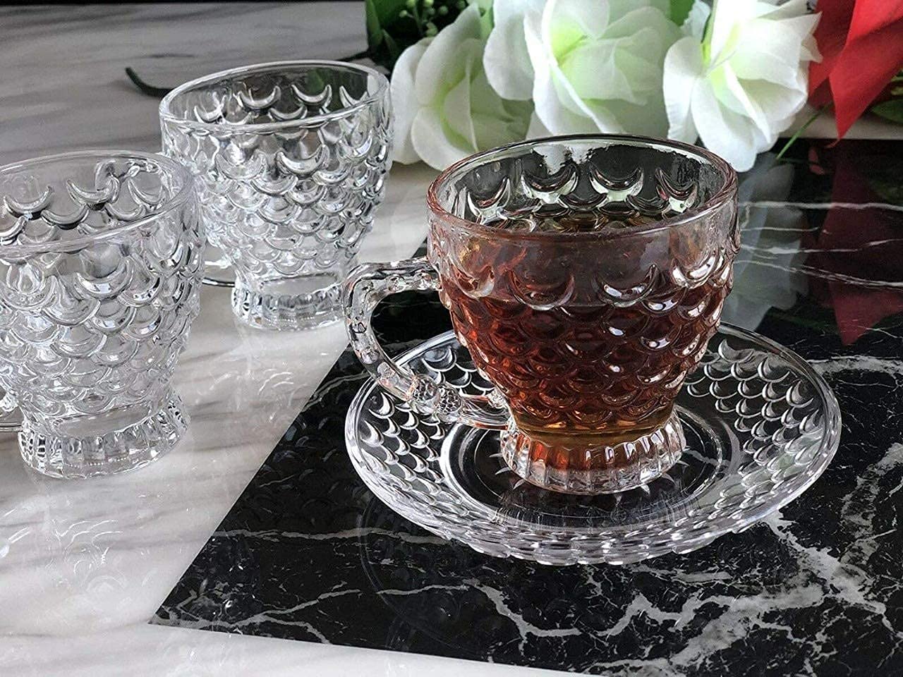 Crafted with exceptional precision, these tea cups and saucers are made from high-quality borosilicate glass, known for its superior durability and heat resistance. Unlike ordinary glass, borosilicate glass is: