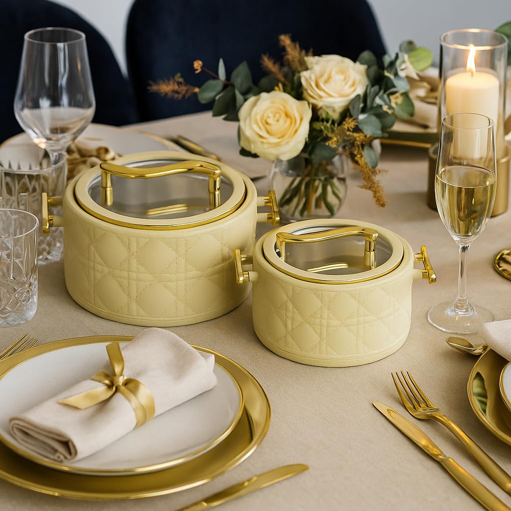 The Premium Insulated Hot Pot Casserole with Glass Lid & Gold Handles is an excellent choice for parties, weddings, festivals, and family gatherings. Its luxurious appearance and efficient performance make it a centerpiece on any dining table. It also serves as a thoughtful and elegant gift for housewarming ceremonies, anniversaries, or festive occasions.