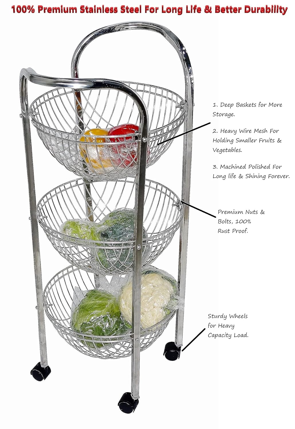 Upgrade your kitchen organisation with the Premium Stainless Steel 3-Tier Kitchen Trolley, a durable, elegant, and highly functional storage solution designed for modern Indian homes. Built to handle everyday demands, this trolley combines rust-proof stainless steel, ventilated baskets, and smooth mobility to keep your essentials accessible, fresh, and neatly arranged—without occupying valuable floor space.