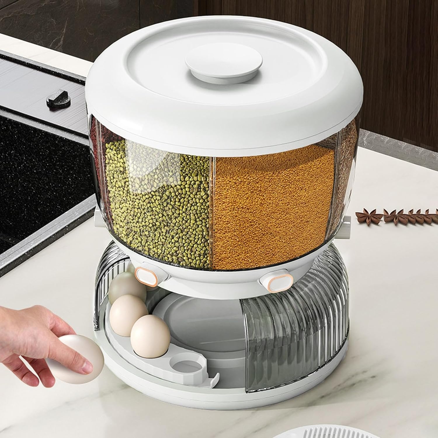 In addition to grain storage, this container includes a dedicated egg holder section. The well-spaced design ensures eggs stay securely in place without rolling or bumping into each other. This multifunctional feature makes the container even more practical, helping you reduce the number of storage items in your kitchen.