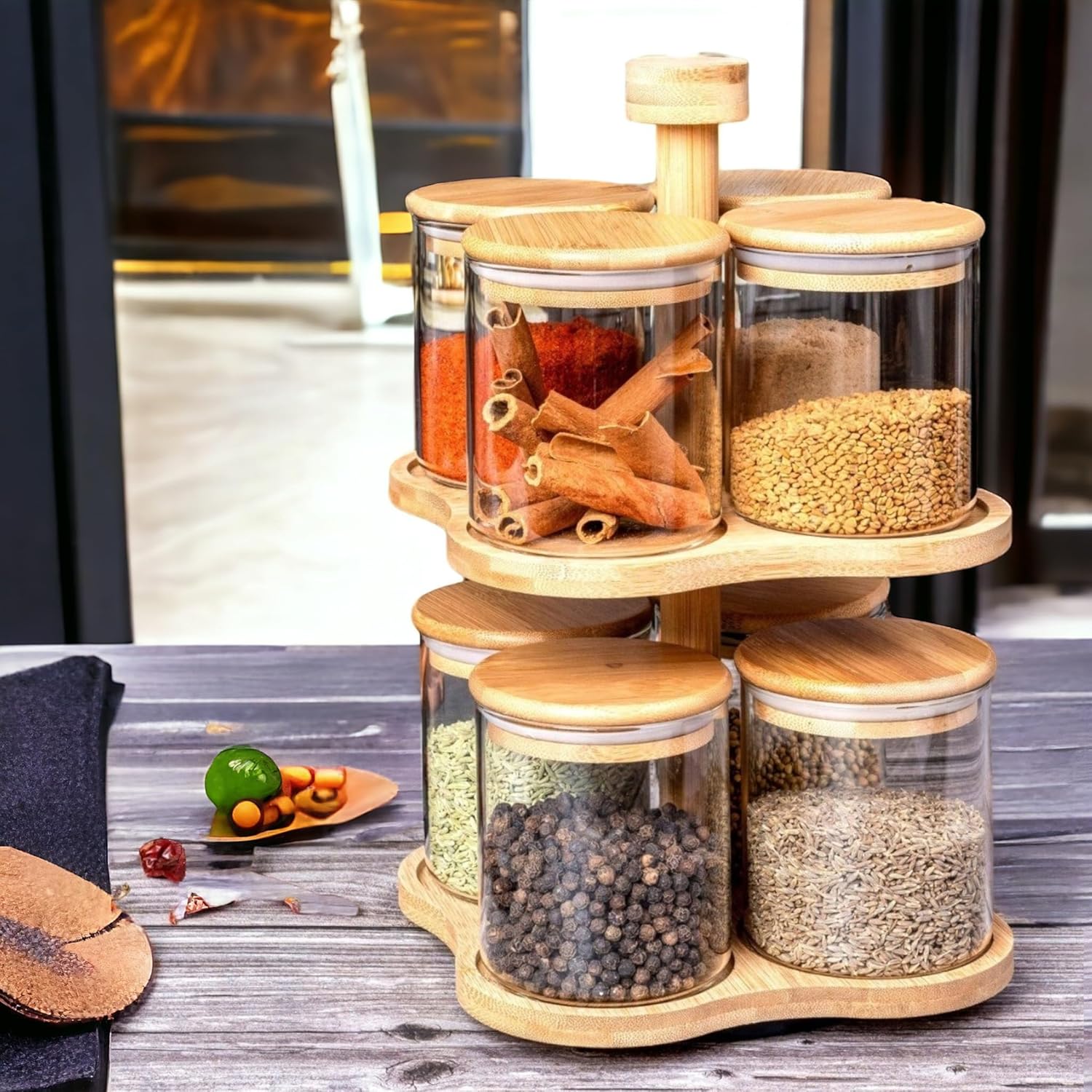 Perfect for spices, dry fruits, coffee, sugar, grains, nuts, and snacks, this rotating jar set enhances your countertop while making everyday cooking more convenient.