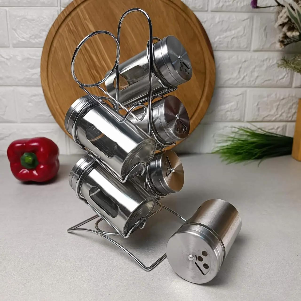 Set of 6 Stainless Steel & Glass Spice Jars with Stand – Elegant Kitchen Spice Storage Solution