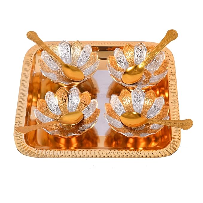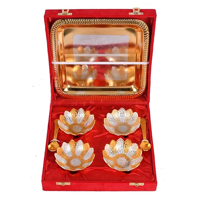 Each bowl in this set is made from high-quality brass, known for its durability and long-lasting shine. The surface is carefully plated with silver and gold, giving it a radiant dual-tone finish. The intricate detailing and elegant design reflect skilled craftsmanship, making each piece not just functional but also decorative.