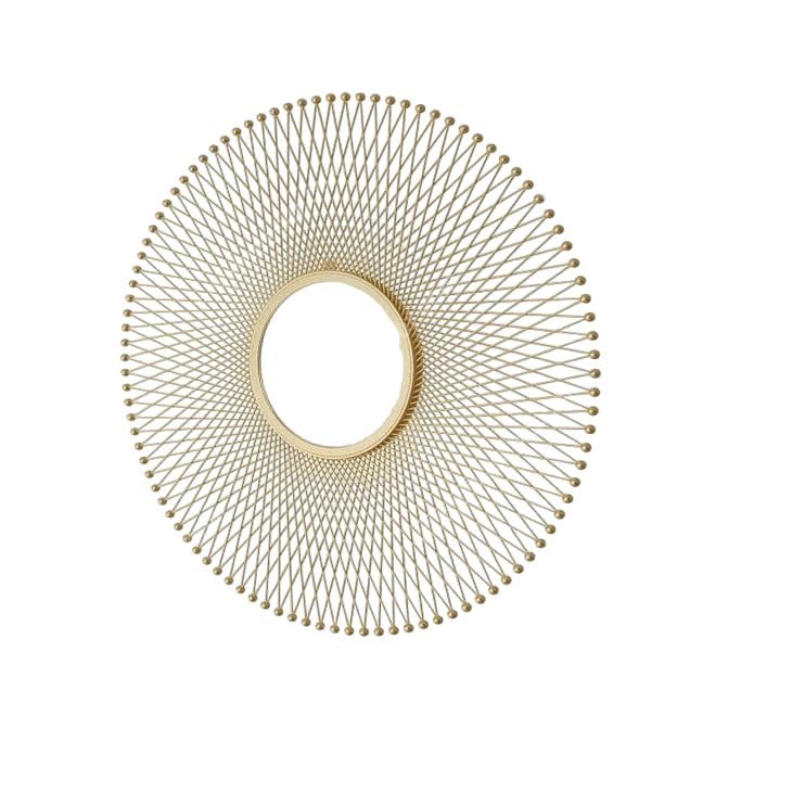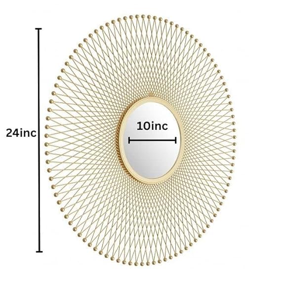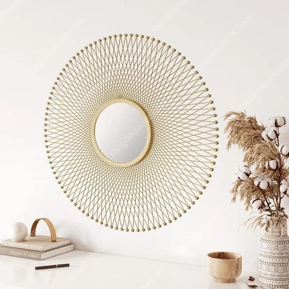 This decorative wall mirror features a stunning golden stainless-steel frame with a modern round silhouette. Its elegant and eye-catching design instantly enhances your wall décor and adds a luxurious touch to any space.