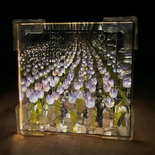 At first glance, the lamp appears as a sleek mirrored cube. Its glossy finish and six reflective panels give it a contemporary, high-end look. But when you switch it on, the true magic begins. Inside, a tulip-shaped floral display lights up, creating an enchanting 3D illusion that looks like a glowing bouquet captured inside a crystal box.